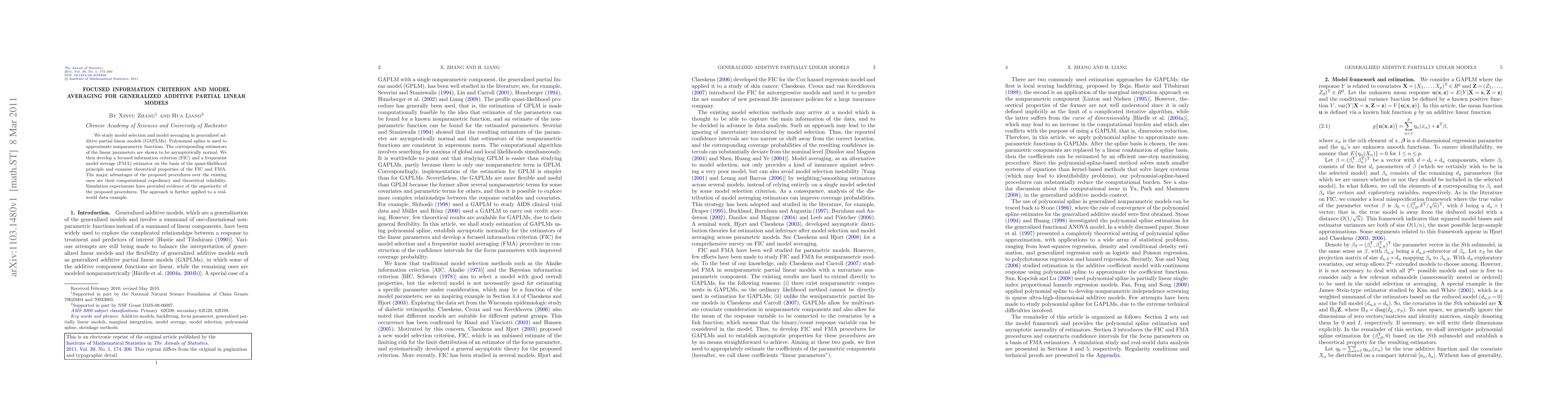 This paper proposes a focused information criterion (FIC) and a frequentist model average (FMA) estimator for generalized additive partial linear models (GAPLMs), demonstrating their computational efficiency and theoretical reliability. Simulation results show the superiority of the proposed methods over existing ones, and the approach is validated with a real-world data example.