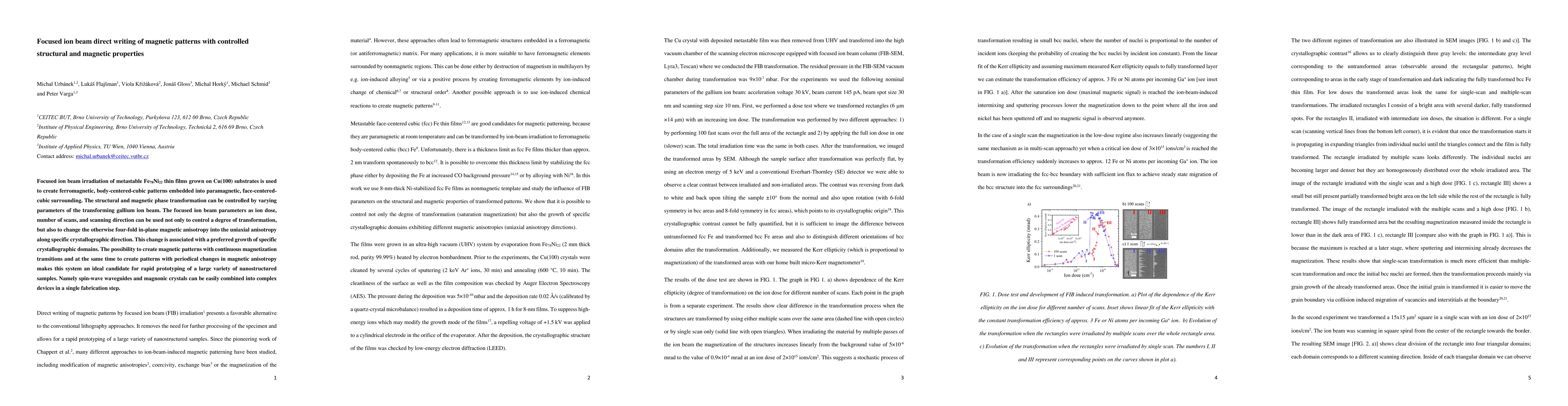 Focused ion beam irradiation of metastable Fe$_{78}$Ni$_{22}$ thin films grown on Cu(100) substrates is used to create ferromagnetic, body-centered-cubic patterns embedded into paramagnetic, face-centered-cubic surrounding. The structural and magnetic phase transformation can be controlled by varying parameters of the transforming gallium ion beam. The focused ion beam parameters as ion dose, number of scans, and scanning direction can be used not only to control a degree of transformation, but also to change the otherwise four-fold in-plane magnetic anisotropy into the uniaxial anisotropy along specific crystallographic direction. This change is associated with a preferred growth of specific crystallographic domains. The possibility to create magnetic patterns with continuous magnetization transitions and at the same time to create patterns with periodical changes in magnetic anisotropy makes this system an ideal candidate for rapid prototyping of a large variety of nanostructured samples. Namely spin-wave waveguides and magnonic crystals can be easily combined into complex devices in a single fabrication step.