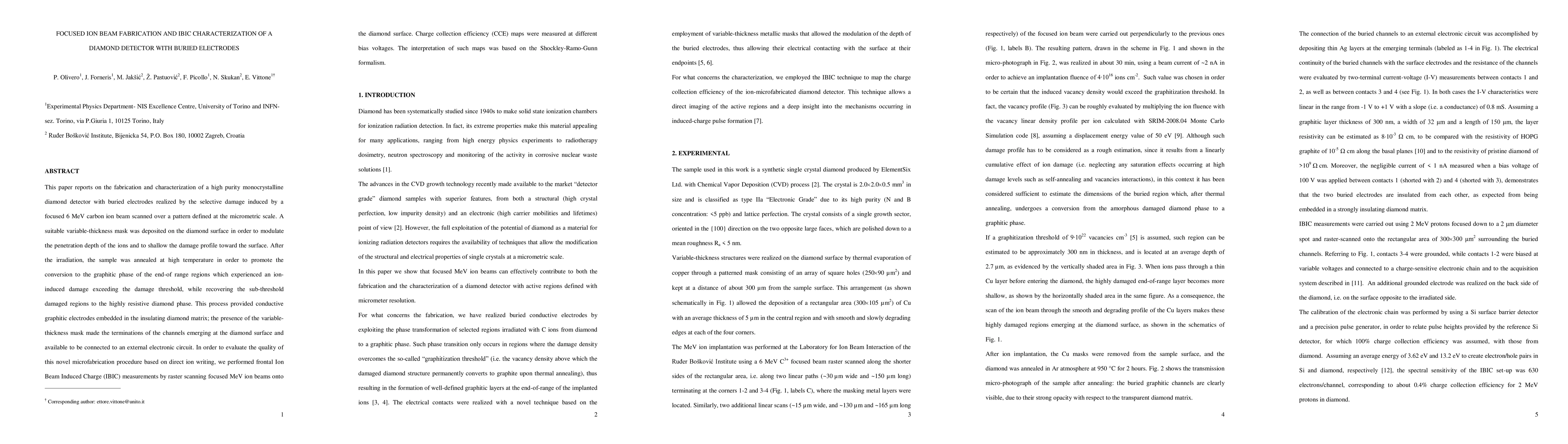 This paper details the fabrication of a diamond detector with buried electrodes using focused ion beam techniques and evaluates its performance via IBIC measurements, revealing high charge collection efficiency. The process involves a variable-thickness mask to control ion penetration and high-temperature annealing to create graphitic electrodes within the diamond matrix.