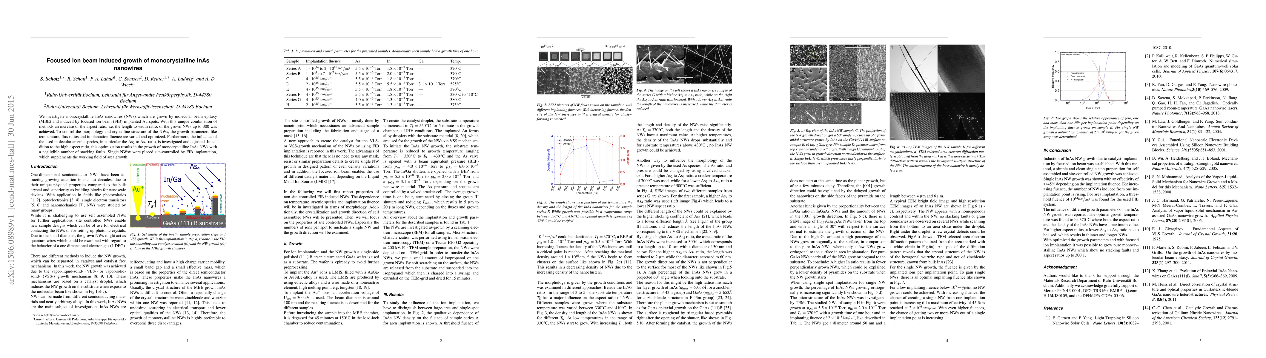 This paper explores the growth of monocrystalline InAs nanowires using focused ion beam (FIB) implantation and molecular beam epitaxy (MBE) techniques, achieving high aspect ratios up to 300. The study optimizes growth parameters and arsenic species ratios to minimize defects and achieve site-controlled placement of single nanowires.