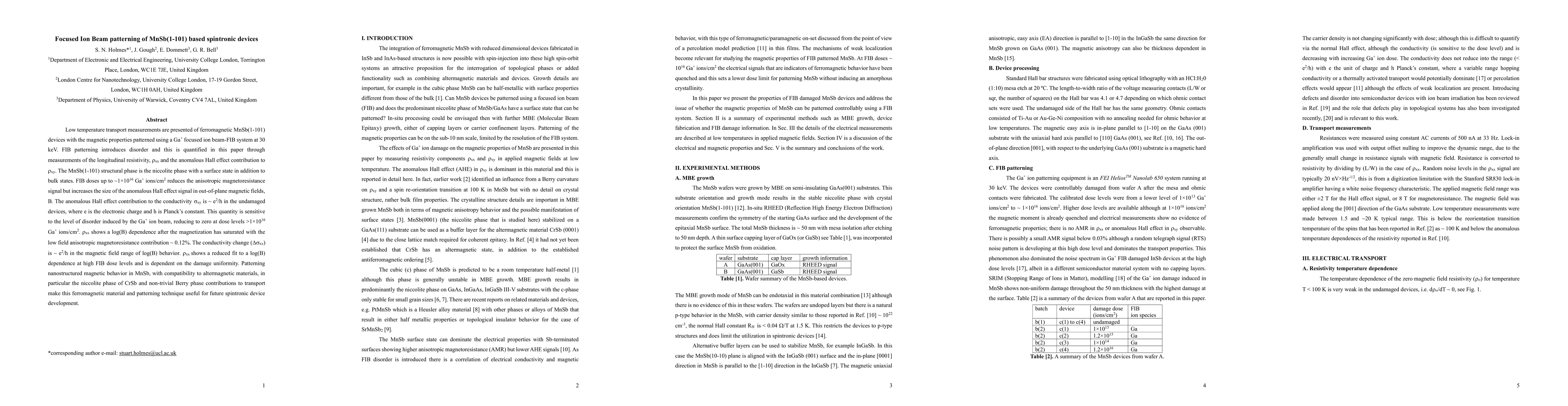 The research utilized focused ion beam (FIB) patterning at 30 keV to introduce disorder in ferromagnetic MnSb devices, with transport measurements performed at low temperatures to analyze the impact of FIB damage on magnetic properties.