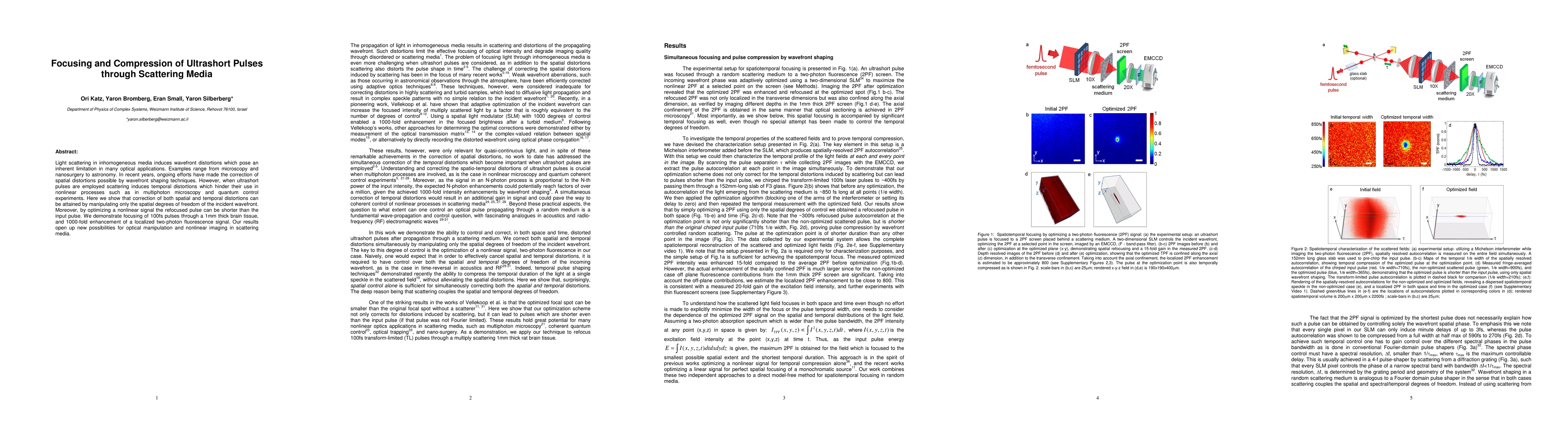 This paper demonstrates a method to correct both spatial and temporal distortions of ultrashort pulses in scattering media by manipulating spatial degrees of freedom, achieving enhanced focusing and shorter pulse durations. The technique enables improved nonlinear imaging applications, such as multiphoton microscopy, through scattering materials like brain tissue.