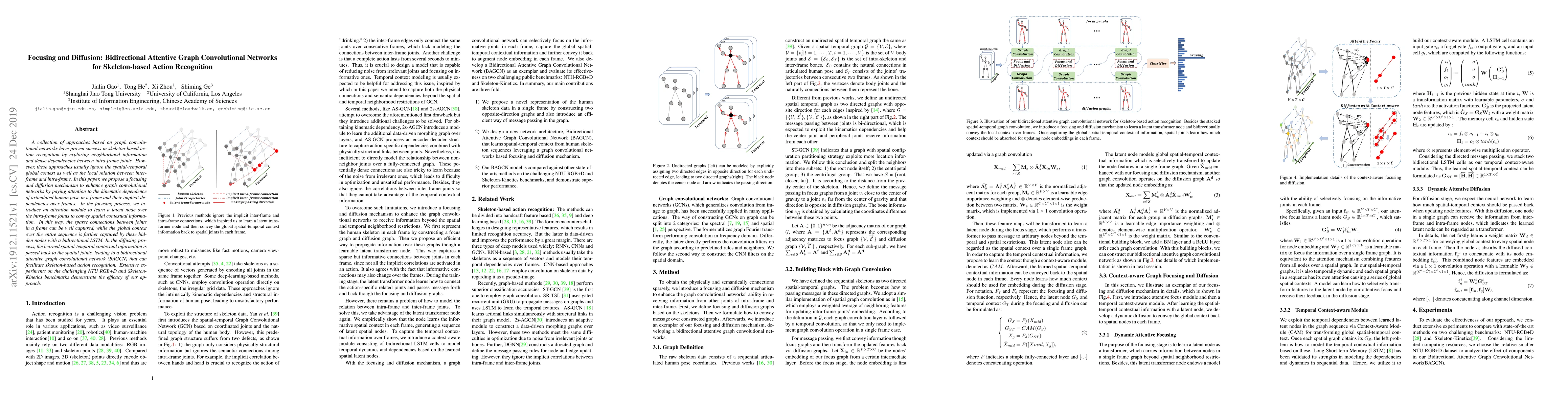 This paper proposes a bidirectional attentive graph convolutional network (BAGCN) for skeleton-based action recognition, incorporating a focusing mechanism to capture intra-frame spatial context and a diffusion mechanism to integrate spatial-temporal global context, significantly improving recognition performance on NTU RGB+D and Skeleton-Kinetics datasets.