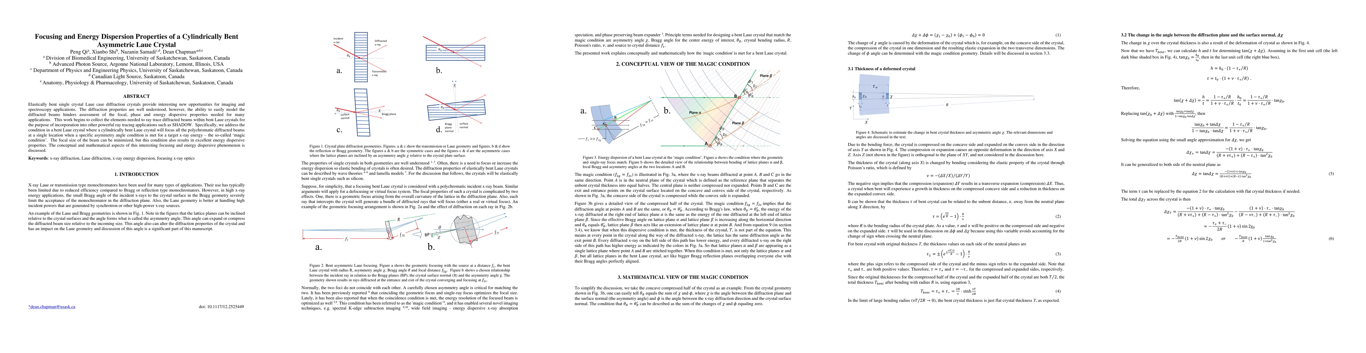 This paper investigates the focusing and energy dispersion properties of a cylindrically bent asymmetric Laue crystal, focusing on the "magic condition" where all polychromatic diffracted beams converge at a single point, minimizing focal size while maintaining excellent energy-dispersive properties. The study aims to facilitate ray tracing of diffracted beams for advanced imaging and spectroscopy applications.
