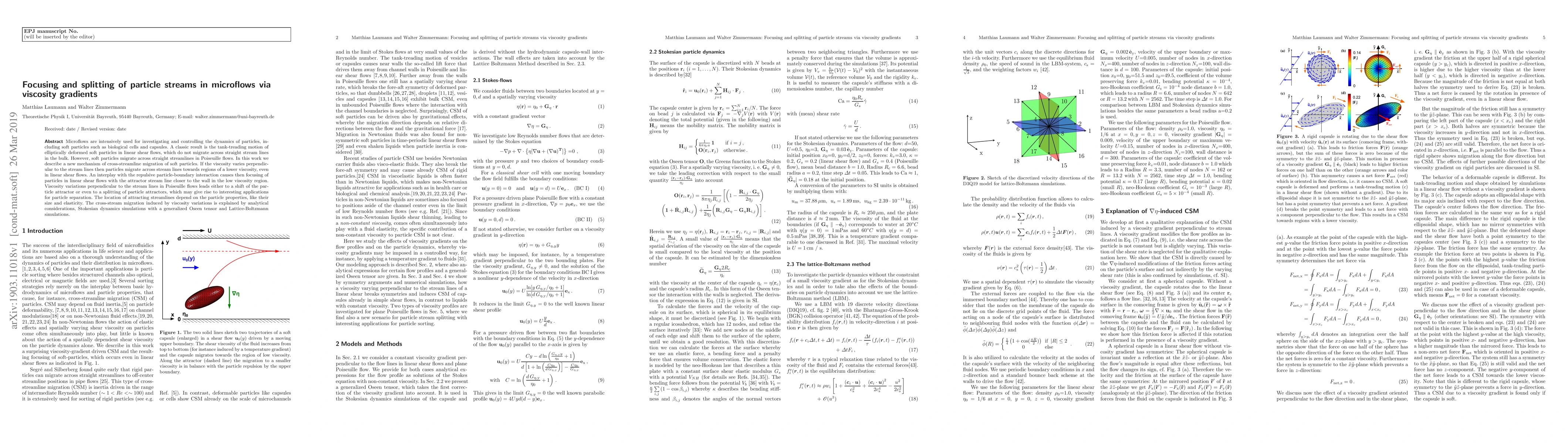 Microflows are intensively used for investigating and controlling the dynamics of particles, including soft particles such as biological cells and capsules. A classic result is the tank-treading motion of elliptically deformed soft particles in linear shear flows, which do not migrate across straight stream lines in the bulk. However, soft particles migrate across straight streamlines in Poiseuille flows. In this work we describe a new mechanism of cross-streamline migration of soft particles. If the viscosity varies perpendicular to the stream lines then particles migrate across stream lines towards regions of a lower viscosity, even in linear shear flows. An interplay with the repulsive particle-boundary interaction causes then focusing of particles in linear shear flows with the attractor stream line closer to the wall in the low viscosity region. Viscosity variations perpendicular to the stream lines in Poiseuille flows leads either to a shift of the particle attractor or even to a splitting of particle attractors, which may give rise to interesting applications for particle separation. The location of attracting streamlines depend on the particle properties, like their size and elasticity. The cross-stream migration induced by viscosity variations is explained by analytical considerations, Stokesian dynamics simulations with a generalized Oseen tensor and Lattice-Boltzmann simulations.