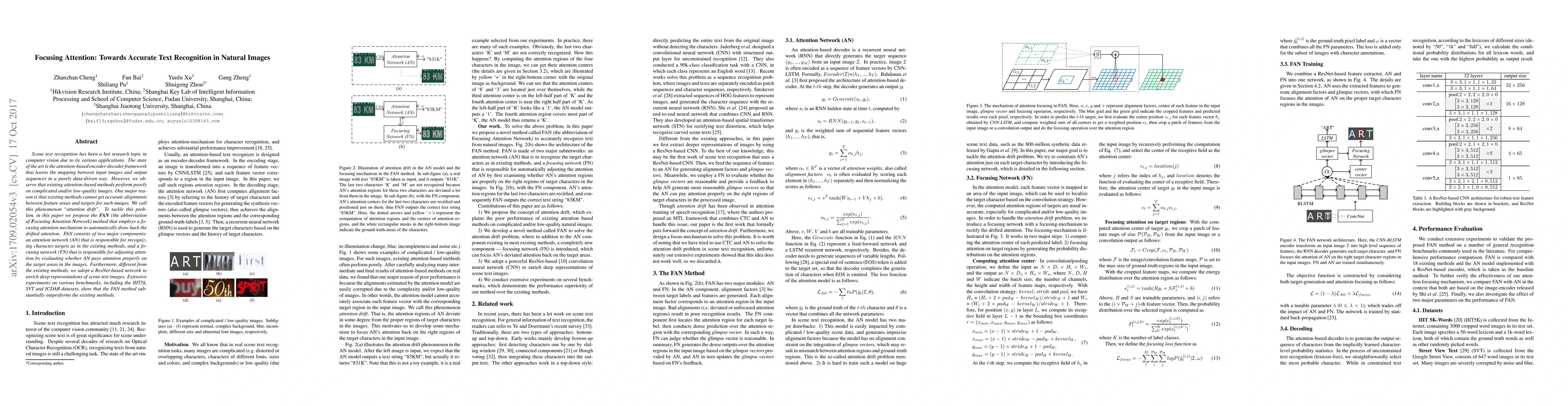 This paper proposes the FAN method to improve text recognition in natural images by addressing "attention drift" through a focusing attention mechanism. The FAN method includes an attention network and a focusing network, with the latter correcting misalignments, and uses a ResNet-based network for enhanced feature representation, achieving superior performance on multiple benchmarks.