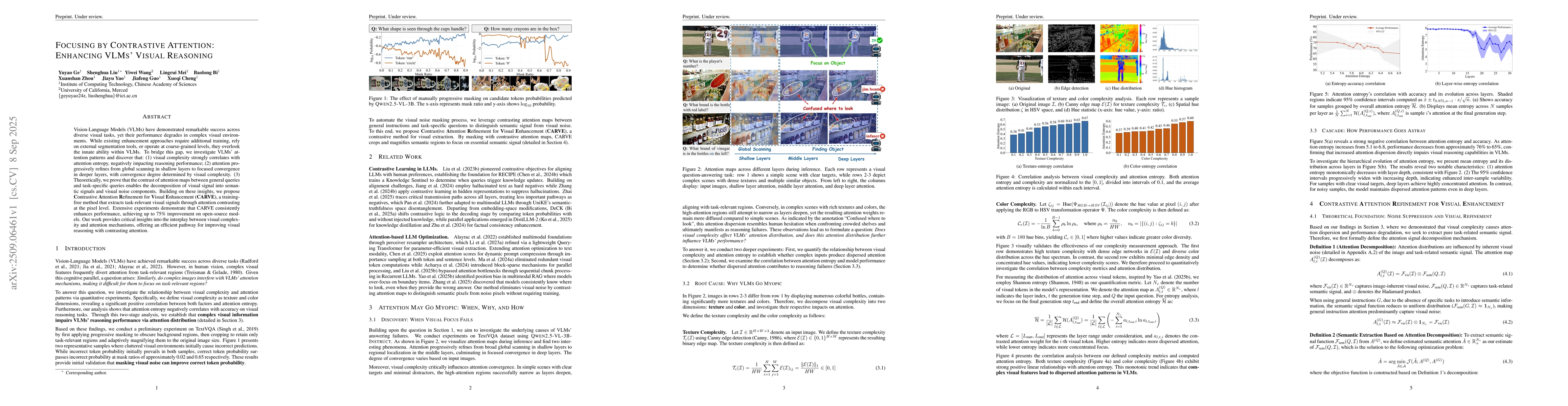 Vision-Language Models (VLMs) have demonstrated remarkable success across diverse visual tasks, yet their performance degrades in complex visual environments. While existing enhancement approaches require additional training, rely on external segmentation tools, or operate at coarse-grained levels, they overlook the innate ability within VLMs. To bridge this gap, we investigate VLMs' attention patterns and discover that: (1) visual complexity strongly correlates with attention entropy, negatively impacting reasoning performance; (2) attention progressively refines from global scanning in shallow layers to focused convergence in deeper layers, with convergence degree determined by visual complexity. (3) Theoretically, we prove that the contrast of attention maps between general queries and task-specific queries enables the decomposition of visual signal into semantic signals and visual noise components. Building on these insights, we propose Contrastive Attention Refinement for Visual Enhancement (CARVE), a training-free method that extracts task-relevant visual signals through attention contrasting at the pixel level. Extensive experiments demonstrate that CARVE consistently enhances performance, achieving up to 75% improvement on open-source models. Our work provides critical insights into the interplay between visual complexity and attention mechanisms, offering an efficient pathway for improving visual reasoning with contrasting attention.