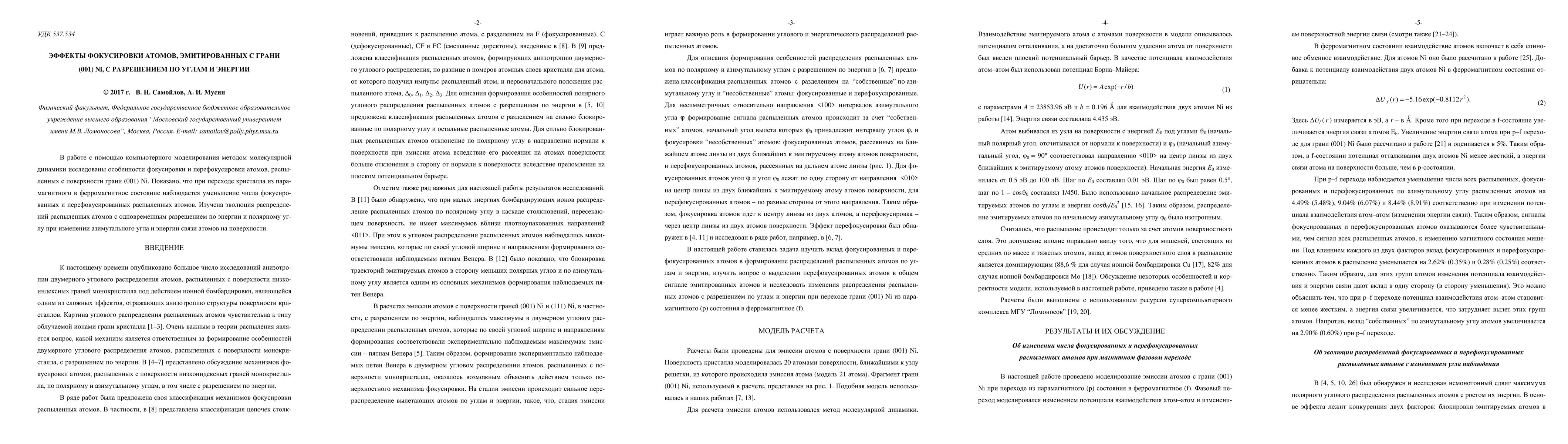 Peculiarities of the focusing and overfocusing of atoms sputtered from the surface of (001) Ni face are studied with the use of molecular dynamics computer simulations. It is discovered that the numbers of focused and overfocused sputtered atoms decrease under the transition of the (001) Ni face from the paramagnetic to the ferromagnetic state. The evolution of the two-dimensional energy and polar angle resolved distributions of sputtered atoms when changing the azimuthal angle and the binding energy of atoms at the surface is investigated.
