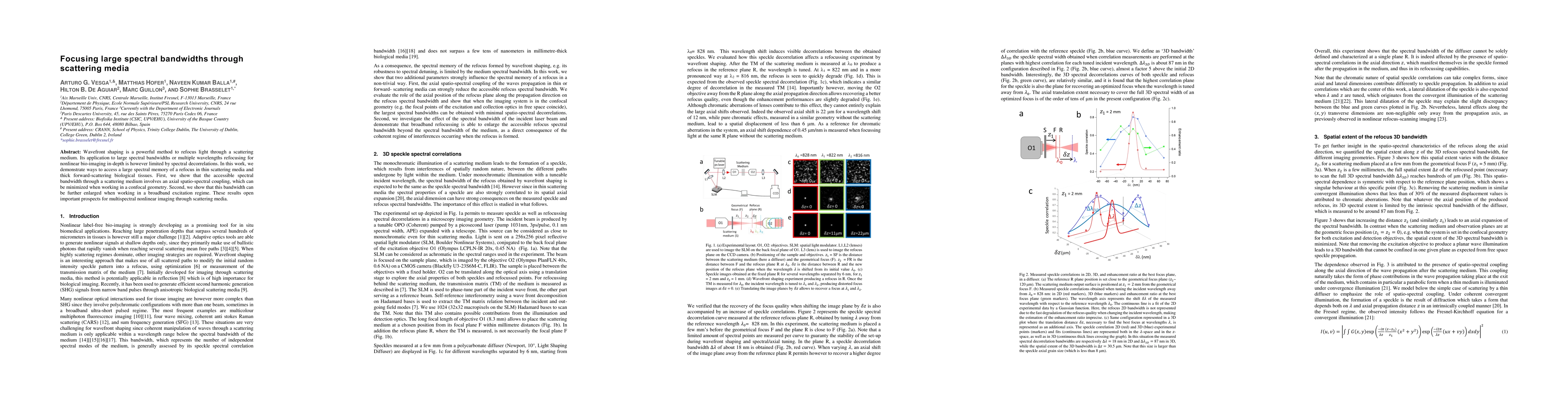 Wavefront shaping is a powerful method to refocus light through a scattering medium. Its application to large spectral bandwidths or multiple wavelengths refocusing for nonlinear bio-imaging in-depth is however limited by spectral decorrelations. In this work, we demonstrate ways to access a large spectral memory of a refocus in thin scattering media and thick forward-scattering biological tissues. First, we show that the accessible spectral bandwidth through a scattering medium involves an axial spatio-spectral coupling, which can be minimized when working in a confocal geometry. Second, we show that this bandwidth can be further enlarged when working in a broadband excitation regime. These results open important prospects for multispectral nonlinear imaging through scattering media.