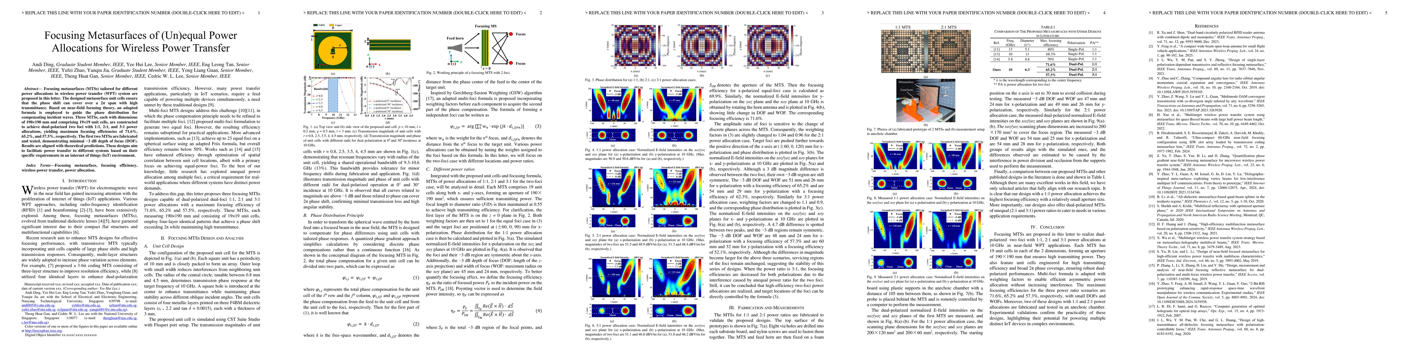 Researchers designed focusing metasurfaces for efficient wireless power transfer with varying power allocations, achieving maximum efficiencies of 71.6%, 65.2%, and 57.5% in different configurations.
