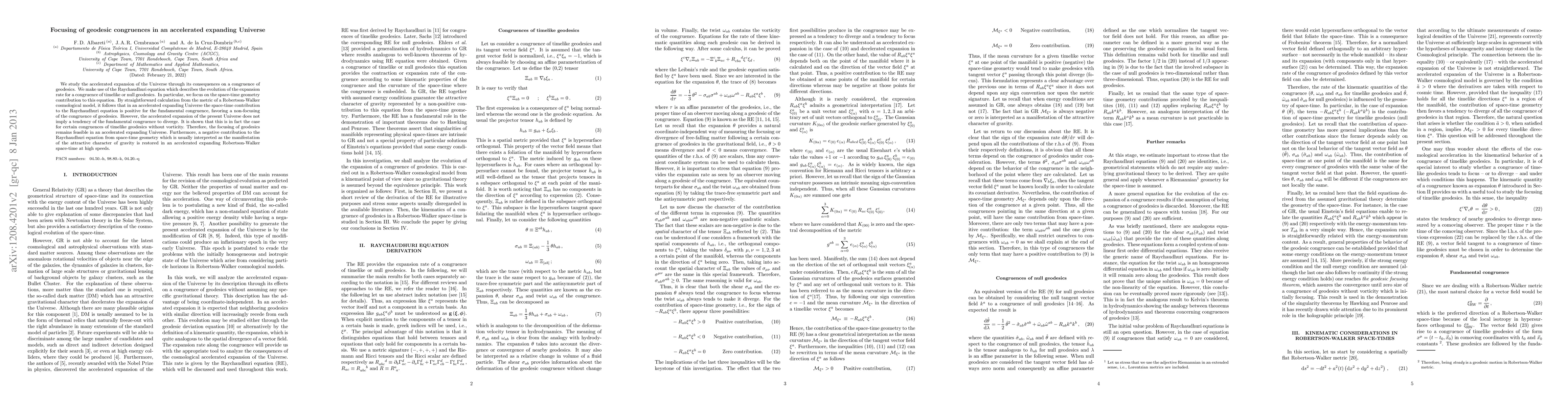 We study the accelerated expansion of the Universe through its consequences on a congruence of geodesics. We make use of the Raychaudhuri equation which describes the evolution of the expansion rate for a congruence of timelike or null geodesics. In particular, we focus on the space-time geometry contribution to this equation. By straightforward calculation from the metric of a Robertson-Walker cosmological model, it follows that in an accelerated expanding Universe the space-time contribution to the Raychaudhuri equation is positive for the fundamental congruence, favoring a non-focusing of the congruence of geodesics. However, the accelerated expansion of the present Universe does not imply a tendency of the fundamental congruence to diverge. It is shown that this is in fact the case for certain congruences of timelike geodesics without vorticity. Therefore, the focusing of geodesics remains feasible in an accelerated expanding Universe. Furthermore, a negative contribution to the Raychaudhuri equation from space-time geometry which is usually interpreted as the manifestation of the attractive character of gravity is restored in an accelerated expanding Robertson-Walker space-time at high speeds.