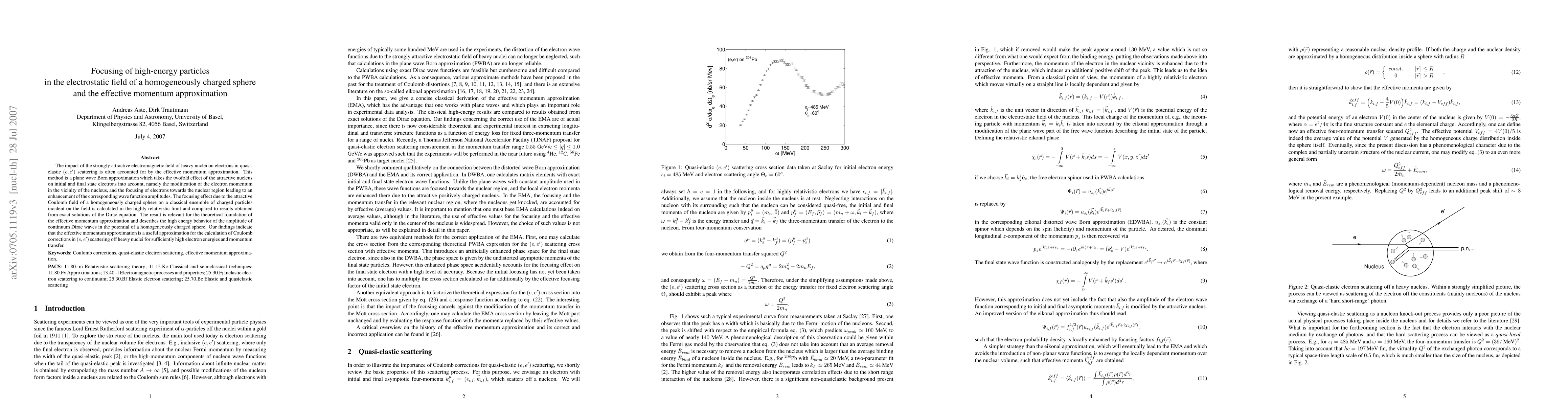 This paper investigates the focusing effect of high-energy electrons in the electrostatic field of a homogeneously charged sphere, relevant for understanding quasi-elastic (e,e') scattering off heavy nuclei. The effective momentum approximation is validated for high electron energies and momentum transfer, showing its utility in describing Coulomb corrections.