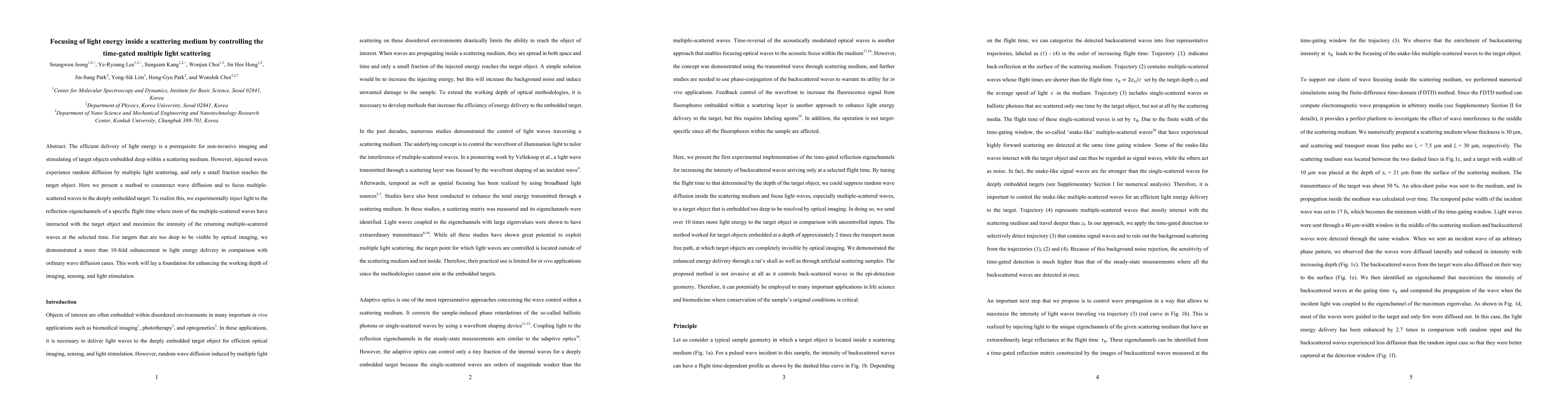 This paper proposes a method to focus light energy deep within a scattering medium by controlling time-gated multiple light scattering, achieving over 10-fold enhancement in light delivery compared to conventional diffusion. The technique involves injecting light into specific reflection eigenchannels at a precise flight time to maximize the intensity of returning scattered waves.