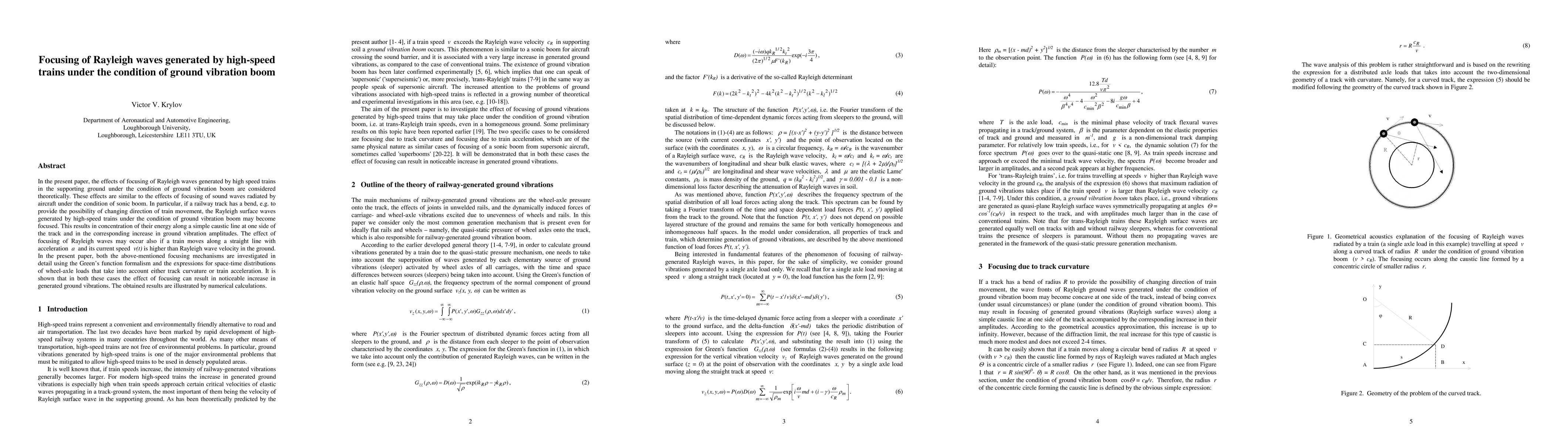 In the present paper, the effects of focusing of Rayleigh waves generated by high speed trains in the supporting ground under the condition of ground vibration boom are considered theoretically. These effects are similar to the effects of focusing of sound waves radiated by aircraft under the condition of sonic boom. In particular, if a railway track has a bend to provide the possibility of changing direction of train movement, the Rayleigh surface waves generated by high-speed trains under the condition of ground vibration boom may become focused. This results in concentration of their energy along a simple caustic line at one side of the track and in the corresponding increase in ground vibration amplitudes. The effect of focusing of Rayleigh waves may occur also if a train moves along a straight line with acceleration and its current speed is higher than Rayleigh wave velocity in the ground. The obtained results are illustrated by numerical calculations.