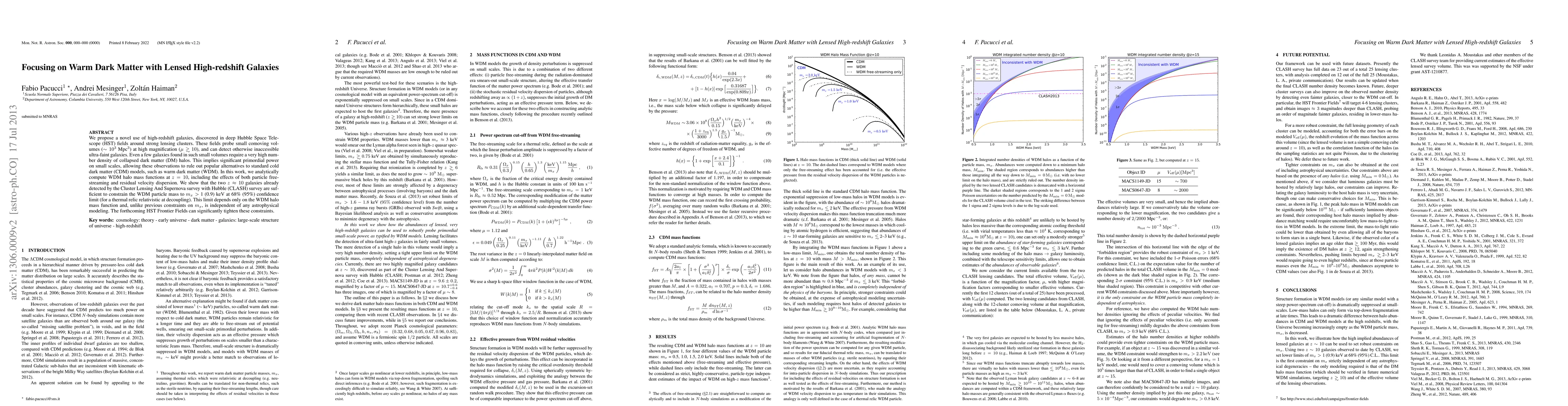 We propose a novel use of high-redshift galaxies, discovered in deep Hubble Space Telescope (HST) fields around strong lensing clusters. These fields probe small comoving volumes (about 1000 cubic Mpc) at high magnification ({\mu} > 10), and can detect otherwise inaccessible ultra-faint galaxies. Even a few galaxies found in such small volumes require a very high number density of collapsed dark matter (DM) halos. This implies significant primordial power on small scales, allowing these observations to rule out popular alternatives to standard cold dark matter (CDM) models, such as warm dark matter (WDM). In this work, we analytically compute WDM halo mass functions at z = 10, including the effects of both particle free-streaming and residual velocity dispersion. The preliminary number density corresponding to the two galaxies at z about 10 already detected by the Cluster Lensing And Supernova survey with Hubble (CLASH) constrains the WDM particle mass to m_x > 1 (0.9) keV at 84% (99.9%) confidence limit (for a thermal relic relativistic at decoupling). This limit depends only on the WDM halo mass function and, unlike previous constraints on m_x, is independent of any astrophysical modeling. The forthcoming HST Frontier Fields can significantly tighten these constraints.