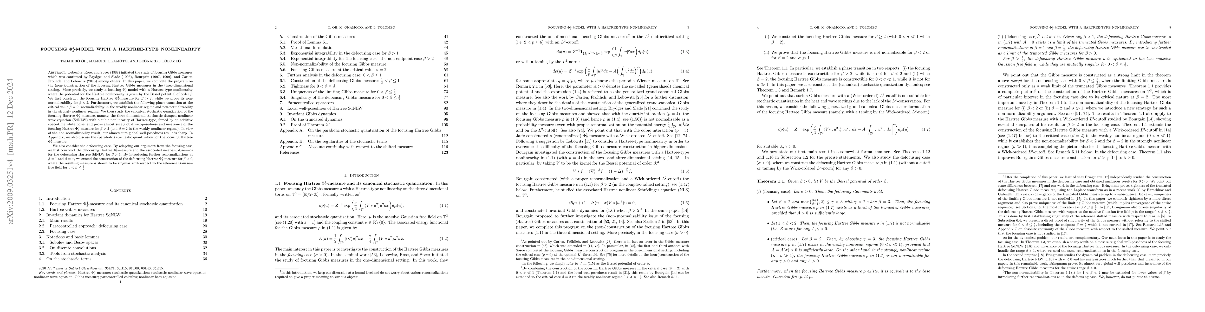 (Due to the limit on the number of characters for an abstract set by arXiv, the full abstract can not be displayed here. See the abstract in the paper.) Lebowitz, Rose, and Speer (1988) initiated the study of focusing Gibbs measures, which was continued by Brydges and Slade (1996), Bourgain (1997, 1999), and Carlen, Fr\"ohlich, and Lebowitz (2016) among others. In this paper, we complete the program on the (non-)construction of the focusing Hartree Gibbs measures in the three-dimensional setting. More precisely, we study a focusing $\Phi^4_3$-model with a Hartree-type nonlinearity, where the potential for the Hartree nonlinearity is given by the Bessel potential of order $\beta$. We first construct the focusing Hartree $\Phi^4_3$-measure for $\beta > 2$, while we prove its non-normalizability for $\beta < 2$. Furthermore, we establish the following phase transition at the critical value $\beta = 2$: normalizability in the weakly nonlinear regime and non-normalizability in the strongly nonlinear regime. We then study the canonical stochastic quantization of the focusing Hartree $\Phi^4_3$-measure, namely, the three-dimensional stochastic damped nonlinear wave equation (SdNLW) with a cubic nonlinearity of Hartree-type, forced by an additive space-time white noise, and prove almost sure global well-posedness and invariance of the focusing Hartree $\Phi^4_3$-measure for $\beta > 2$ (and $\beta = 2$ in the weakly nonlinear regime). In view of the non-normalizability result, our almost sure global well-posedness result is sharp. In Appendix, we also discuss the (parabolic) stochastic quantization for the focusing Hartree $\Phi^4_3$-measure. We also construct the defocusing Hartree $\Phi^4_3$-measure for $\beta > 0$.