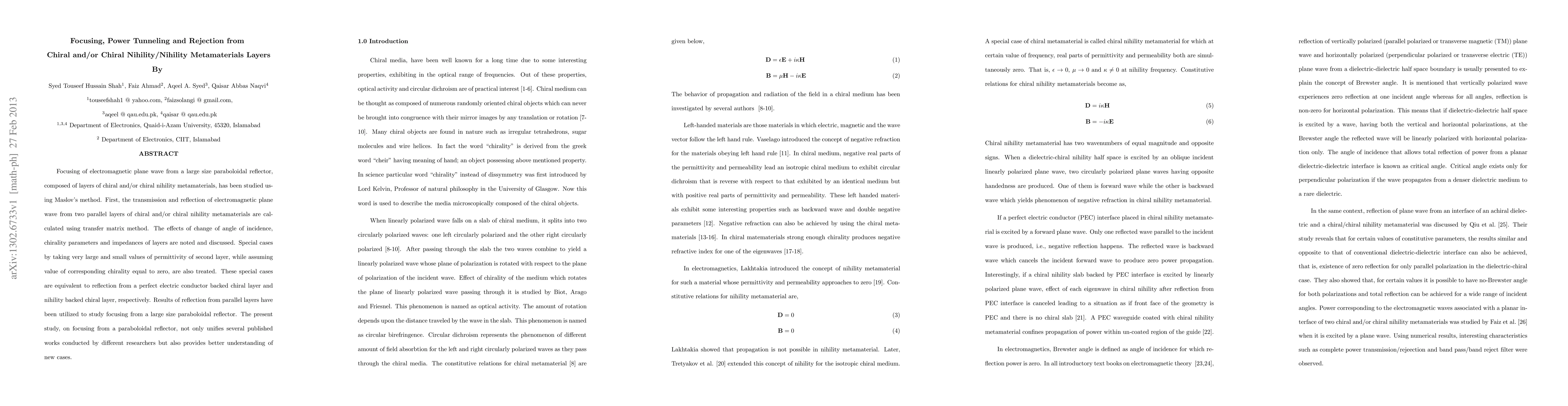 This paper investigates the focusing of electromagnetic waves using a paraboloidal reflector composed of chiral and/or chiral nihility metamaterials. It employs Maslov's method and the transfer matrix technique to analyze wave transmission and reflection through these layers, discussing the impact of incidence angles and material parameters.