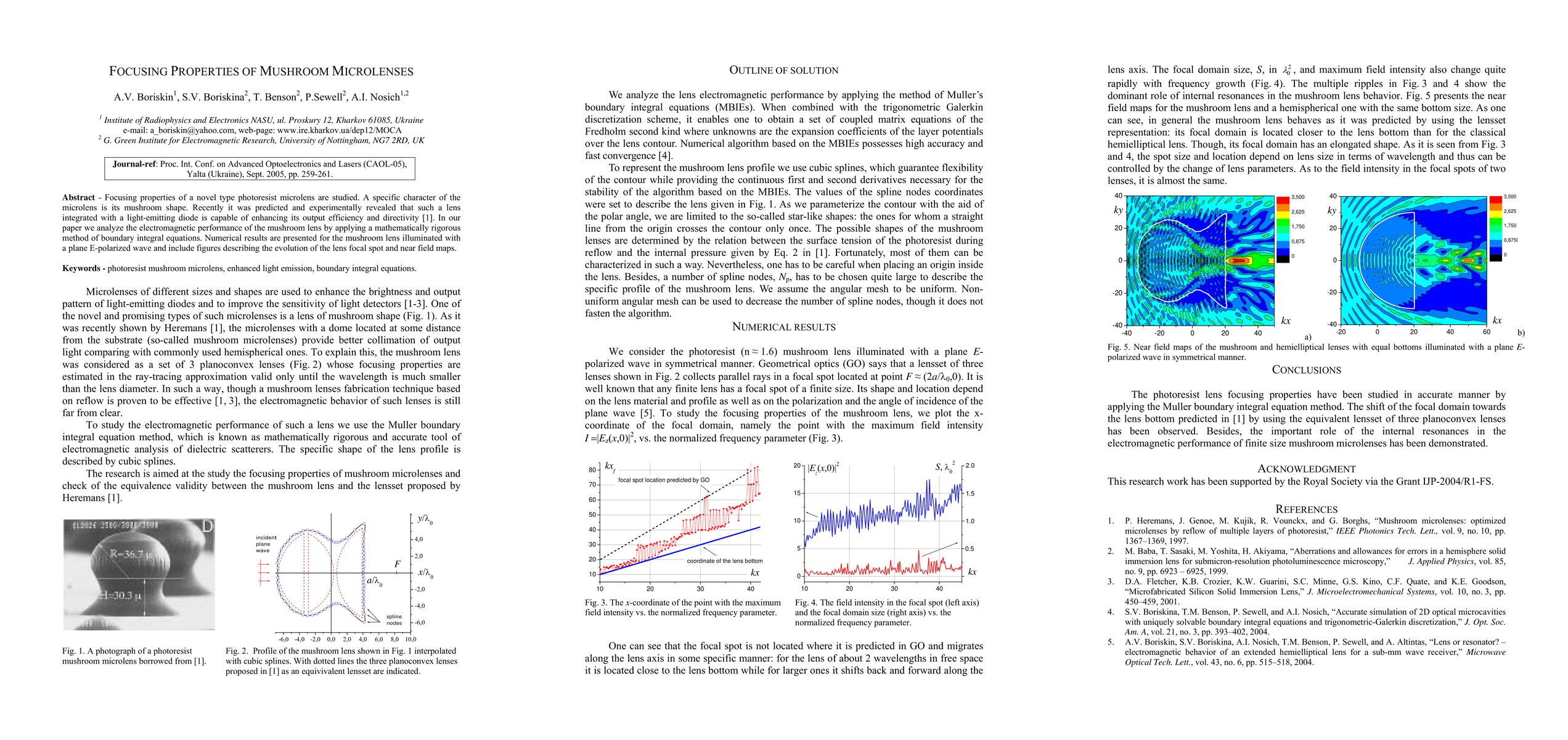 This paper investigates the electromagnetic performance of mushroom-shaped microlenses using boundary integral equations. Results demonstrate enhanced output efficiency and directivity of light-emitting diodes when integrated with these lenses, supported by figures of focal spot evolution and near-field maps.