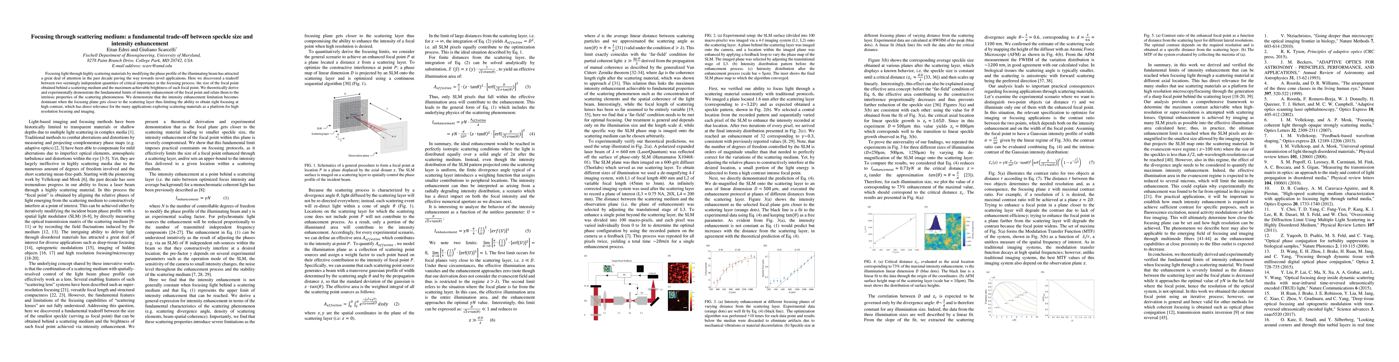 Focusing light through highly scattering materials by modifying the phase profile of the illuminating beam has attracted a great deal of attention in the past decade paving the way towards novel applications. Here we discovered a tradeoff between two seemingly independent quantities of critical importance in the focusing process: the size of the focal point obtained behind a scattering medium and the maximum achievable brightness of such focal point. We theoretically derive and experimentally demonstrate the fundamental limits of intensity enhancement of the focal point and relate them to the intrinsic properties of the scattering phenomenon. We demonstrate that the intensity enhancement limitation becomes dominant when the focusing plane gets closer to the scattering layer thus limiting the ability to obtain tight focusing at high contrast, which has direct relevance for the many applications exploring scattering materials as a platform for high resolution focusing and imaging