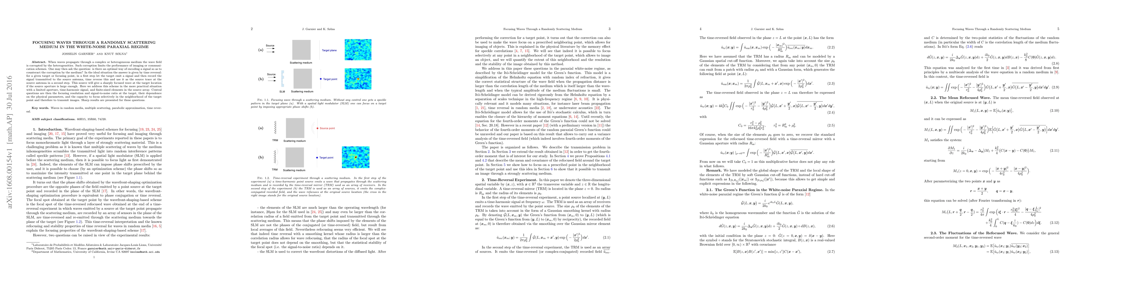 When waves propagate through a complex or heterogeneous medium the wave field is corrupted by the heterogeneities. Such corruption limits the performance of imaging or communication schemes. One may then ask the question: is there an optimal way of encoding a signal so as to counteract the corruption by the medium? In the ideal situation the answer is given by time reversal: for a given target or focusing point, in a first step let the target emit a signal and then record the signal transmitted to the source antenna, time reverse this and use it as the source trace at the source antenna in a second step. This source will give a sharply focused wave at the target location if the source aperture is large enough. Here we address this scheme in the more practical situation with a limited aperture, time-harmonic signal, and finite-sized elements in the source array. Central questions are then the focusing resolution and signal-to-noise ratio at the target, their dependence on the physical parameters, and the capacity to focus selectively in the neighborhood of the target point and therefore to transmit images. Sharp results are presented for these questions.