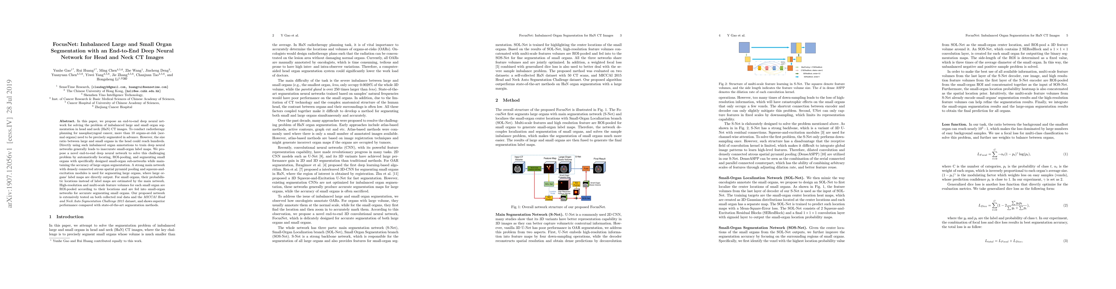 FocusNet is an end-to-end deep neural network designed to accurately segment both large and small organs in head and neck CT images, addressing the challenge of imbalanced organ sizes. It employs specialized small-organ sub-networks and a main network with atrous spatial pyramid pooling and squeeze-and-excitation modules to achieve superior segmentation performance compared to state-of-the-art methods.