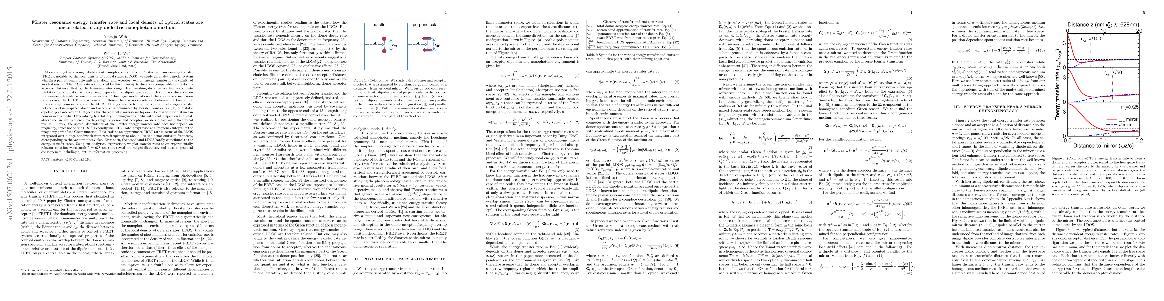 Motivated by the ongoing debate about nanophotonic control of Foerster resonance energy transfer (FRET), notably by the local density of optical states (LDOS), we study an analytic model system wherein a pair of ideal dipole emitters - donor and acceptor - exhibit energy transfer in the vicinity of an ideal mirror. The FRET rate is controlled by the mirror up to distances comparable to the donor-acceptor distance, that is, the few-nanometer range. For vanishing distance, we find a complete inhibition or a four-fold enhancement, depending on dipole orientation. For mirror distances on the wavelength scale, where the well-known `Drexhage' modification of the spontaneous-emission rate occurs, the FRET rate is constant. Hence there is no correlation between the Foerster (or total) energy transfer rate and the LDOS. At any distance to the mirror, the total energy transfer between a closely-spaced donor and acceptor is dominated by Foerster transfer, i.e., by the static dipole-dipole interaction that yields the characteristic inverse-sixth-power donor-acceptor distance dependence in homogeneous media. Generalizing to arbitrary inhomogeneous media with weak dispersion and weak absorption in the frequency overlap range of donor and acceptor, we derive two main theoretical results. Firstly, the spatially dependent Foerster energy transfer rate does not depend on frequency, hence not on the LDOS. Secondly the FRET rate is expressed as a frequency integral of the imaginary part of the Green function. This leads to an approximate FRET rate in terms of the LDOS integrated over a huge bandwidth from zero frequency to about 10 times the donor emission frequency, corresponding to the vacuum-ultraviolet. Even then, the broadband LDOS hardly contributes to the energy transfer rates. We discuss practical consequences including quantum information processing.