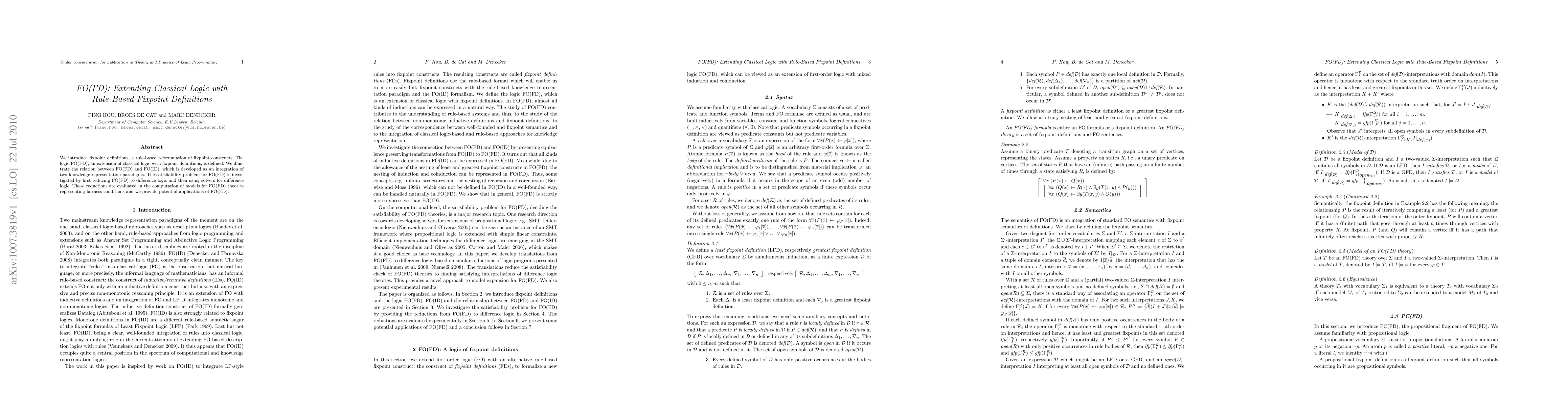 We introduce fixpoint definitions, a rule-based reformulation of fixpoint constructs. The logic FO(FD), an extension of classical logic with fixpoint definitions, is defined. We illustrate the relation between FO(FD) and FO(ID), which is developed as an integration of two knowledge representation paradigms. The satisfiability problem for FO(FD) is investigated by first reducing FO(FD) to difference logic and then using solvers for difference logic. These reductions are evaluated in the computation of models for FO(FD) theories representing fairness conditions and we provide potential applications of FO(FD).