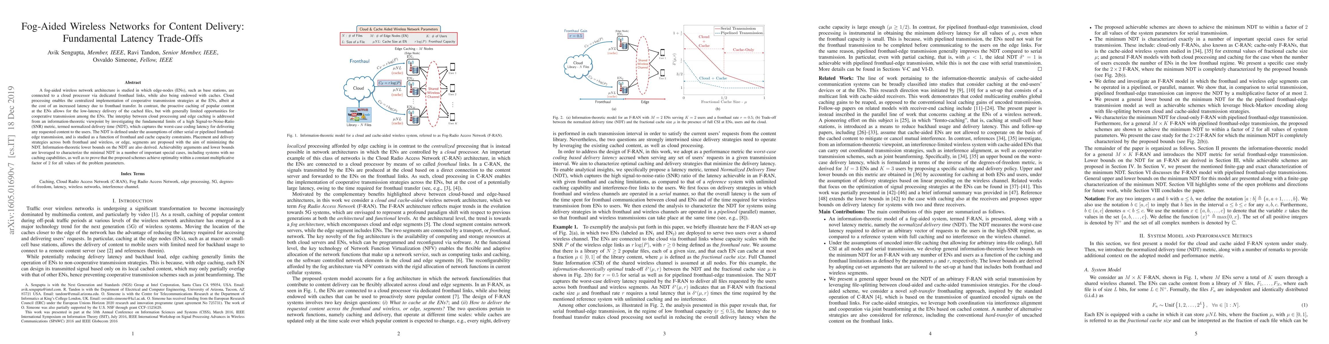A fog-aided wireless network architecture is studied in which edge-nodes (ENs), such as base stations, are connected to a cloud processor via dedicated fronthaul links, while also being endowed with caches. Cloud processing enables the centralized implementation of cooperative transmission strategies at the ENs, albeit at the cost of an increased latency due to fronthaul transfer. In contrast, the proactive caching of popular content at the ENs allows for the low-latency delivery of the cached files, but with generally limited opportunities for cooperative transmission among the ENs. The interplay between cloud processing and edge caching is addressed from an information-theoretic viewpoint by investigating the fundamental limits of a high Signal-to-Noise-Ratio (SNR) metric, termed normalized delivery time (NDT), which captures the worst-case coding latency for delivering any requested content to the users. The NDT is defined under the assumptions of either serial or pipelined fronthaul-edge transmission, and is studied as a function of fronthaul and cache capacity constraints. Placement and delivery strategies across both fronthaul and wireless, or edge, segments are proposed with the aim of minimizing the NDT. Information-theoretic lower bounds on the NDT are also derived. Achievability arguments and lower bounds are leveraged to characterize the minimal NDT in a number of important special cases, including systems with no caching capabilities, as well as to prove that the proposed schemes achieve optimality within a constant multiplicative factor of 2 for all values of the problem parameters.