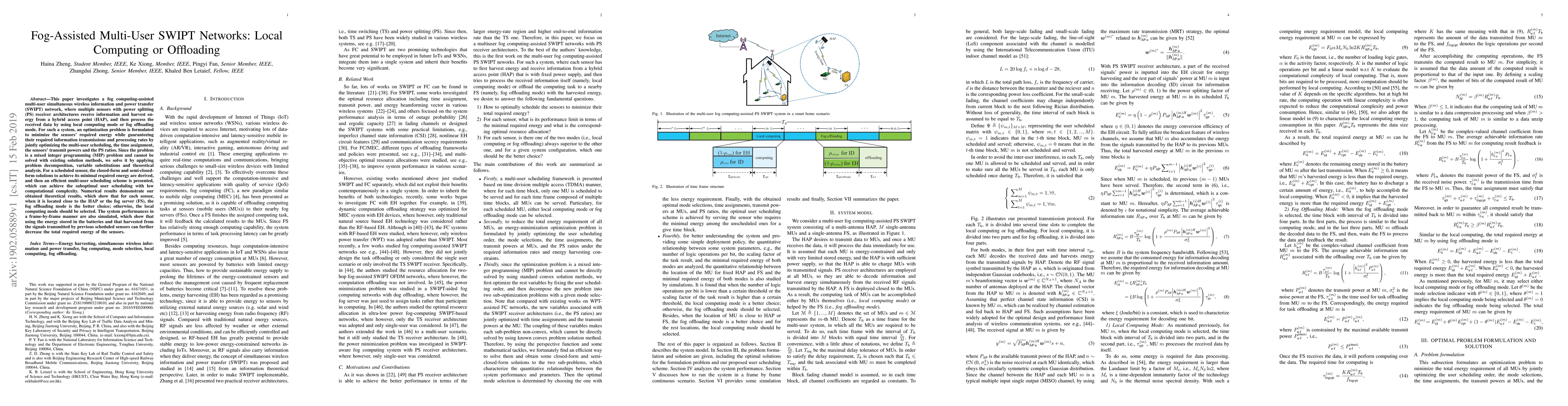 This paper investigates a fog computing-assisted multi-user simultaneous wireless information and power transfer (SWIPT) network, where multiple sensors with power splitting (PS) receiver architectures receive information and harvest energy from a hybrid access point (HAP), and then process the received data by using local computing mode or fog offloading mode. For such a system, an optimization problem is formulated to minimize the sensors' required energy while guaranteeing their required information transmissions and processing rates by jointly optimizing the multi-user scheduling, the time assignment, the sensors' transmit powers and the PS ratios. Since the problem is a mixed integer programming (MIP) problem and cannot be solved with existing solution methods, we solve it by applying problem decomposition, variable substitutions and theoretical analysis. For a scheduled sensor, the closed-form and semi-closedform solutions to achieve its minimal required energy are derived, and then an efficient multi-user scheduling scheme is presented, which can achieve the suboptimal user scheduling with low computational complexity. Numerical results demonstrate our obtained theoretical results, which show that for each sensor, when it is located close to the HAP or the fog server (FS), the fog offloading mode is the better choice; otherwise, the local computing mode should be selected. The system performances in a frame-by-frame manner are also simulated, which show that using the energy stored in the batteries and that harvested from the signals transmitted by previous scheduled sensors can further decrease the total required energy of the sensors.