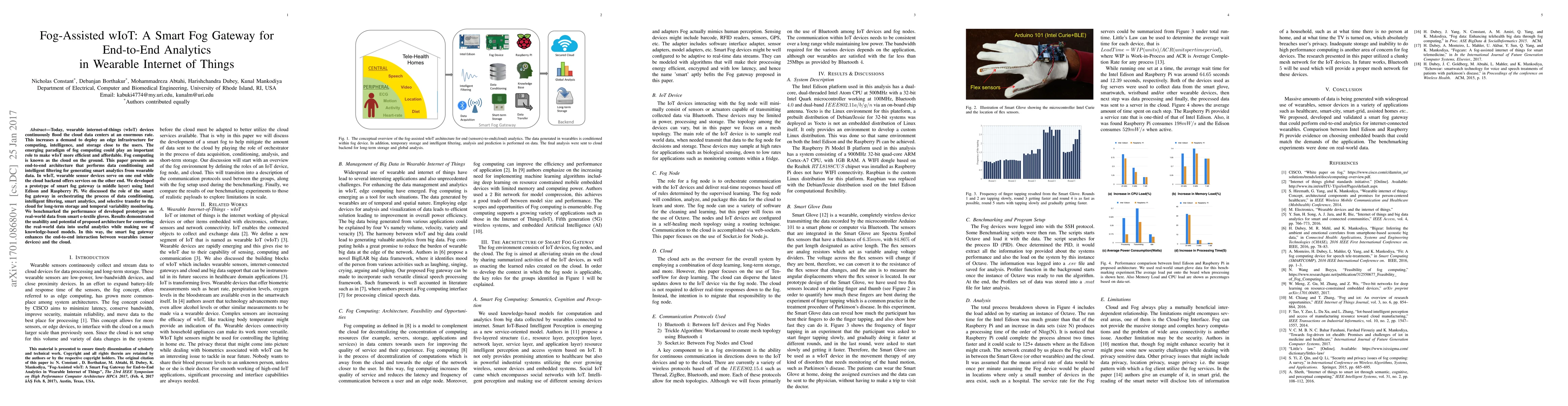 This paper introduces a smart fog gateway for wearable IoT devices to optimize data processing and analytics by leveraging fog computing. The prototype, developed using Intel Edison and Raspberry Pi, facilitates data conditioning, intelligent filtering, and smart analytics, ultimately enhancing the interaction between wearable sensors and cloud services.