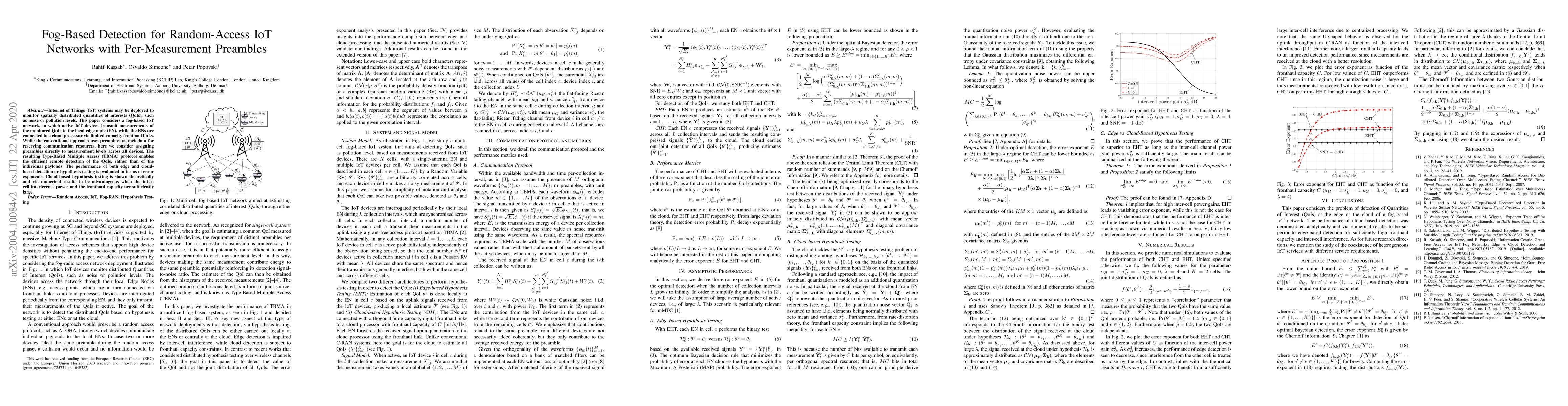 Internet of Things (IoT) systems may be deployed to monitor spatially distributed quantities of interests (QoIs), such as noise or pollution levels. This paper considers a fog-based IoT network, in which active IoT devices transmit measurements of the monitored QoIs to the local edge node (EN), while the ENs are connected to a cloud processor via limited-capacity fronthaul links. While the conventional approach uses preambles as metadata for reserving communication resources, here we consider assigning preambles directly to measurement levels across all devices. The resulting Type-Based Multiple Access (TBMA) protocol enables the efficient remote detection of the QoIs, rather than of the individual payloads. The performance of both edge and cloud-based detection or hypothesis testing is evaluated in terms of error exponents. Cloud-based hypothesis testing is shown theoretically and via numerical results to be advantageous when the inter-cell interference power and the fronthaul capacity are sufficiently large.