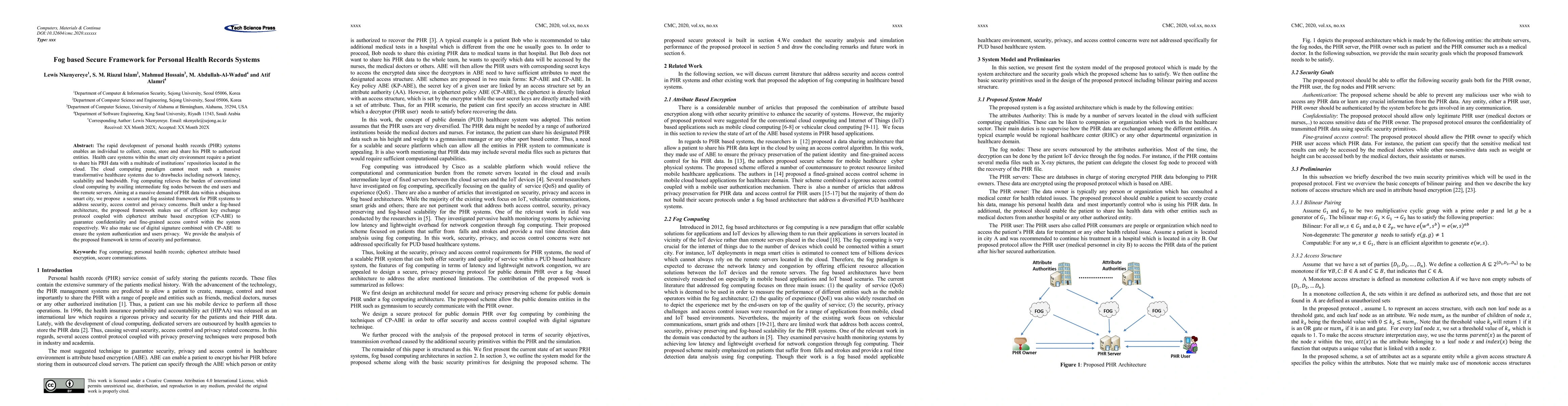 This paper proposes a secure fog-based framework for personal health records (PHR) systems, addressing security, access control, and privacy concerns. The framework utilizes fog computing to mitigate cloud computing drawbacks and employs efficient key exchange and ciphertext attribute-based encryption (CP-ABE) for confidentiality and access control, along with digital signatures for authentication and privacy.