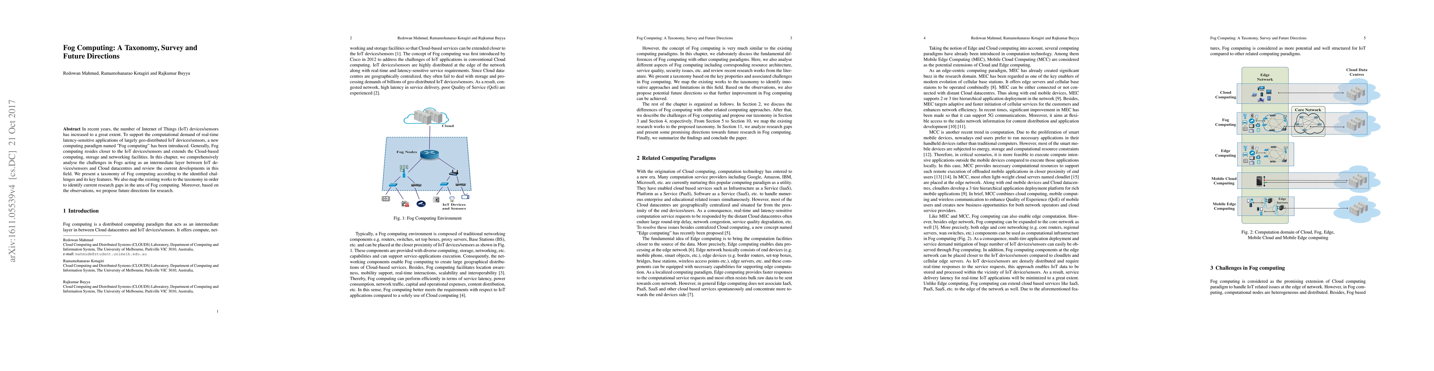 This paper provides a comprehensive analysis of Fog computing, a paradigm to support real-time, low-latency applications for geo-distributed IoT devices. It presents a taxonomy of Fog computing, identifies current research gaps, and proposes future research directions to address challenges in the field.