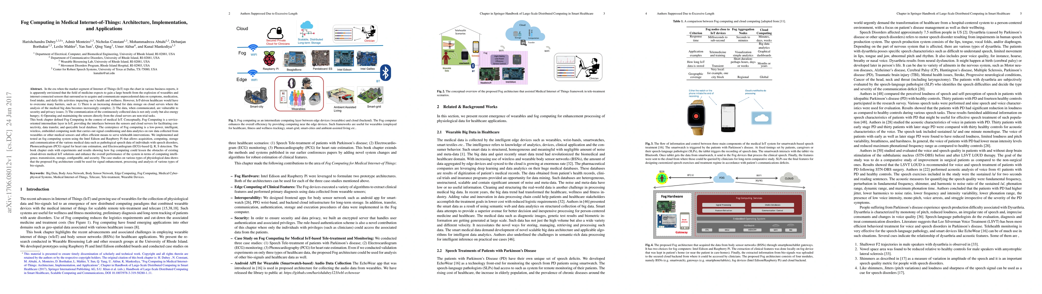 In the era when the market segment of Internet of Things (IoT) tops the chart in various business reports, it is apparently envisioned that the field of medicine expects to gain a large benefit from the explosion of wearables and internet-connected sensors that surround us to acquire and communicate unprecedented data on symptoms, medication, food intake, and daily-life activities impacting one's health and wellness. However, IoT-driven healthcare would have to overcome many barriers, such as: 1) There is an increasing demand for data storage on cloud servers where the analysis of the medical big data becomes increasingly complex, 2) The data, when communicated, are vulnerable to security and privacy issues, 3) The communication of the continuously collected data is not only costly but also energy hungry, 4) Operating and maintaining the sensors directly from the cloud servers are non-trial tasks. This book chapter defined Fog Computing in the context of medical IoT. Conceptually, Fog Computing is a service-oriented intermediate layer in IoT, providing the interfaces between the sensors and cloud servers for facilitating connectivity, data transfer, and queryable local database. The centerpiece of Fog computing is a low-power, intelligent, wireless, embedded computing node that carries out signal conditioning and data analytics on raw data collected from wearables or other medical sensors and offers efficient means to serve telehealth interventions. We implemented and tested an fog computing system using the Intel Edison and Raspberry Pi that allows acquisition, computing, storage and communication of the various medical data such as pathological speech data of individuals with speech disorders, Phonocardiogram (PCG) signal for heart rate estimation, and Electrocardiogram (ECG)-based Q, R, S detection.