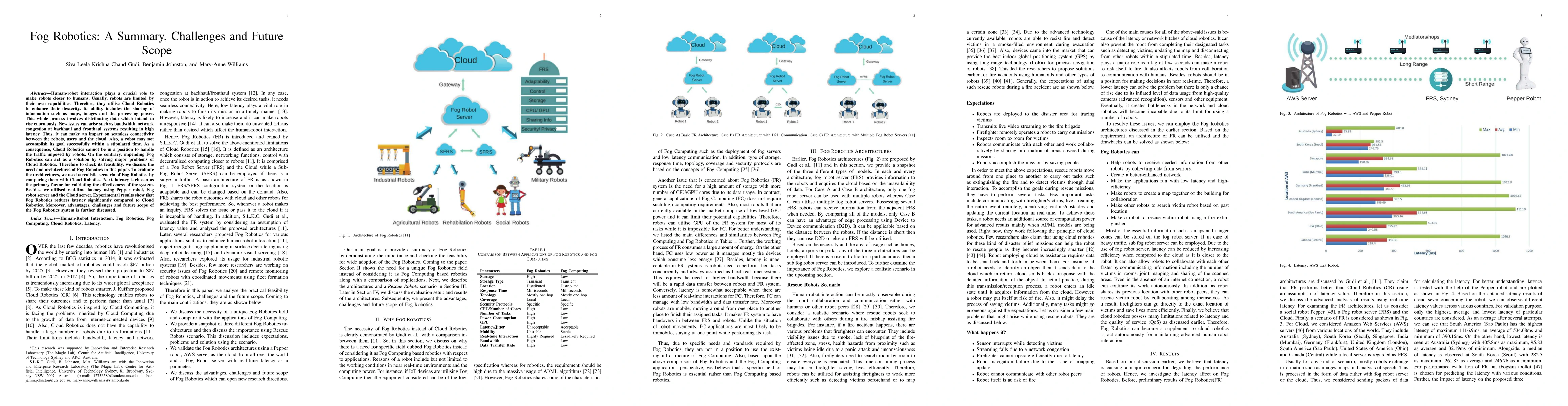 Human-robot interaction plays a crucial role to make robots closer to humans. Usually, robots are limited by their own capabilities. Therefore, they utilise Cloud Robotics to enhance their dexterity. Its ability includes the sharing of information such as maps, images and the processing power. This whole process involves distributing data which intend to rise enormously. New issues can arise such as bandwidth, network congestion at backhaul and fronthaul systems resulting in high latency. Thus, it can make an impact on seamless connectivity between the robots, users and the cloud. Also, a robot may not accomplish its goal successfully within a stipulated time. As a consequence, Cloud Robotics cannot be in a position to handle the traffic imposed by robots. On the contrary, impending Fog Robotics can act as a solution by solving major problems of Cloud Robotics. Therefore to check its feasibility, we discuss the need and architectures of Fog Robotics in this paper. To evaluate the architectures, we used a realistic scenario of Fog Robotics by comparing them with Cloud Robotics. Next, latency is chosen as the primary factor for validating the effectiveness of the system. Besides, we utilised real-time latency using Pepper robot, Fog robot server and the Cloud server. Experimental results show that Fog Robotics reduces latency significantly compared to Cloud Robotics. Moreover, advantages, challenges and future scope of the Fog Robotics system is further discussed.