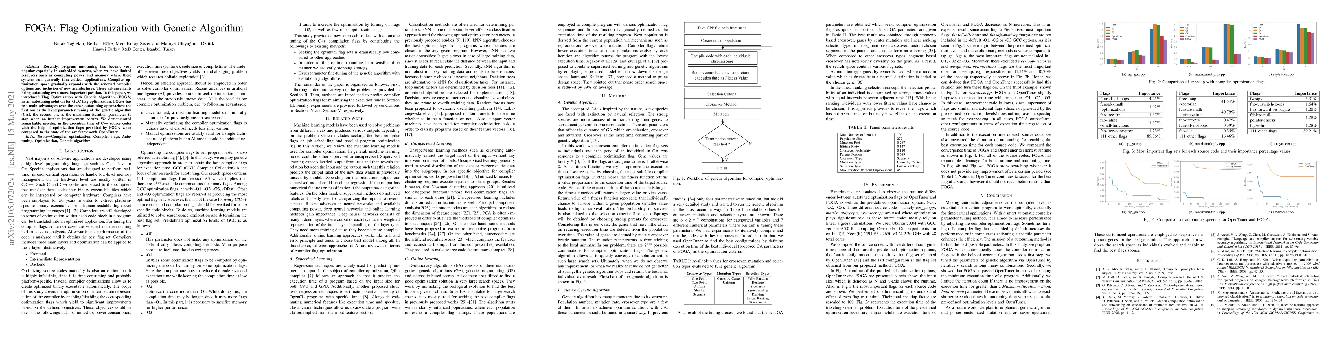 FOGA employs a Genetic Algorithm for GCC flag optimization to enhance program autotuning, particularly in resource-constrained embedded systems. It offers significant speedup in C++ code execution through hyperparameter tuning and a stopping criterion, outperforming the state-of-the-art OpenTuner.