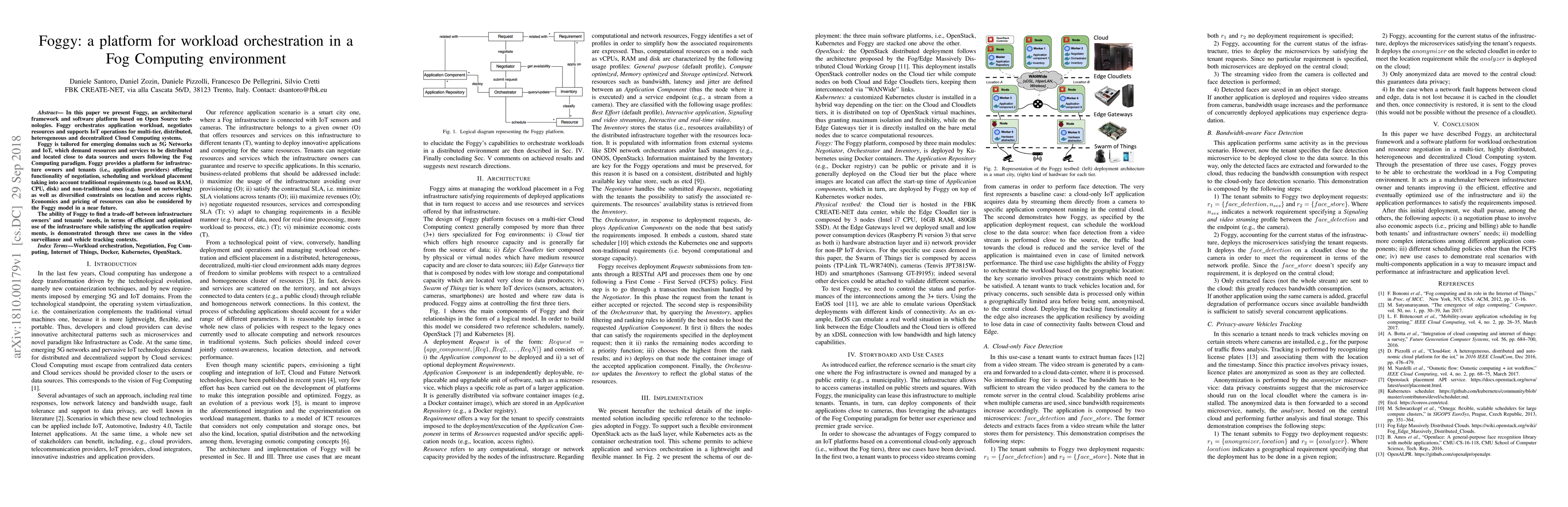 In this paper we present Foggy, an architectural framework and software platform based on Open Source technologies. Foggy orchestrates application workload, negotiates resources and supports IoT operations for multi-tier, distributed, heterogeneous and decentralized Cloud Computing systems. Foggy is tailored for emerging domains such as 5G Networks and IoT, which demand resources and services to be distributed and located close to data sources and users following the Fog Computing paradigm. Foggy provides a platform for infrastructure owners and tenants (i.e., application providers) offering functionality of negotiation, scheduling and workload placement taking into account traditional requirements (e.g. based on RAM, CPU, disk) and non-traditional ones (e.g. based on networking) as well as diversified constraints on location and access rights. Economics and pricing of resources can also be considered by the Foggy model in a near future. The ability of Foggy to find a trade-off between infrastructure owners' and tenants' needs, in terms of efficient and optimized use of the infrastructure while satisfying the application requirements, is demonstrated through three use cases in the video surveillance and vehicle tracking contexts.