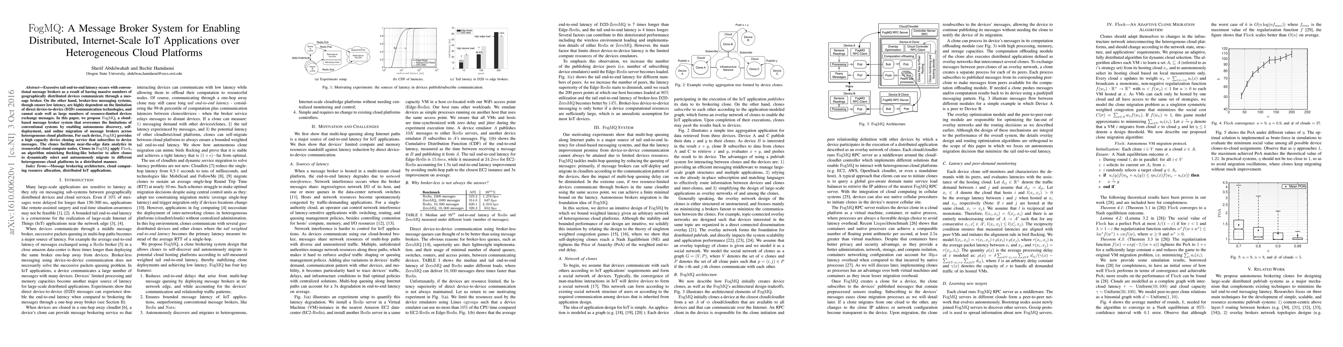 FogMQ is a cloud-based message broker system designed to address the latency issues of conventional brokers and the scalability limitations of broker-less systems. It enables autonomous discovery, self-deployment, and migration of message brokers across heterogeneous cloud platforms, using device cloning and a Flock algorithm for dynamic clone management.