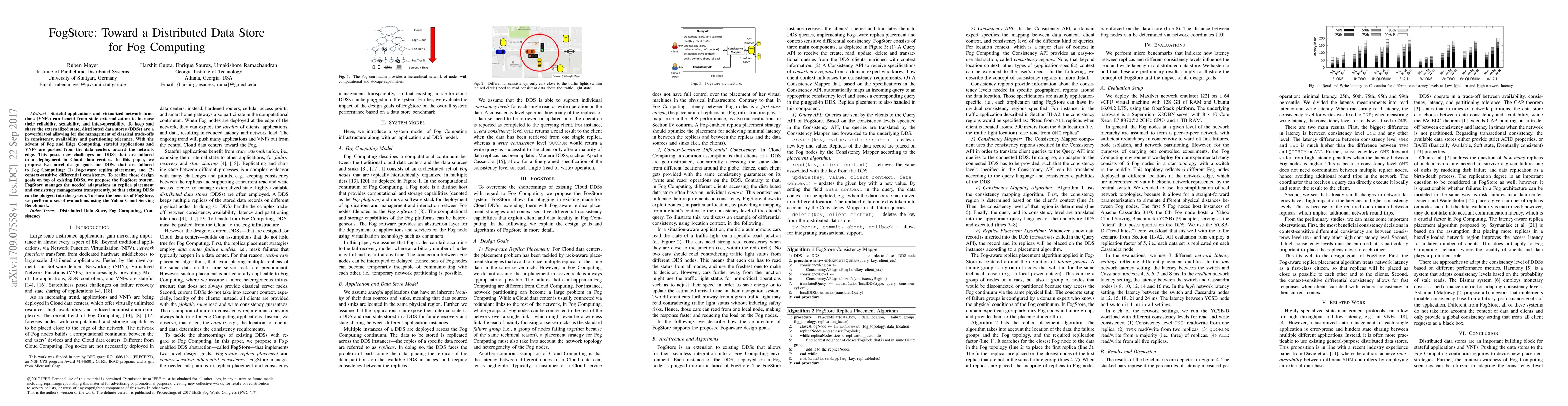 FogStore proposes a distributed data store tailored for Fog Computing, introducing fog-aware replica placement and context-sensitive differential consistency to address the unique challenges posed by moving stateful applications to the network edge. Evaluations demonstrate its effectiveness using the Yahoo Cloud Serving Benchmark.