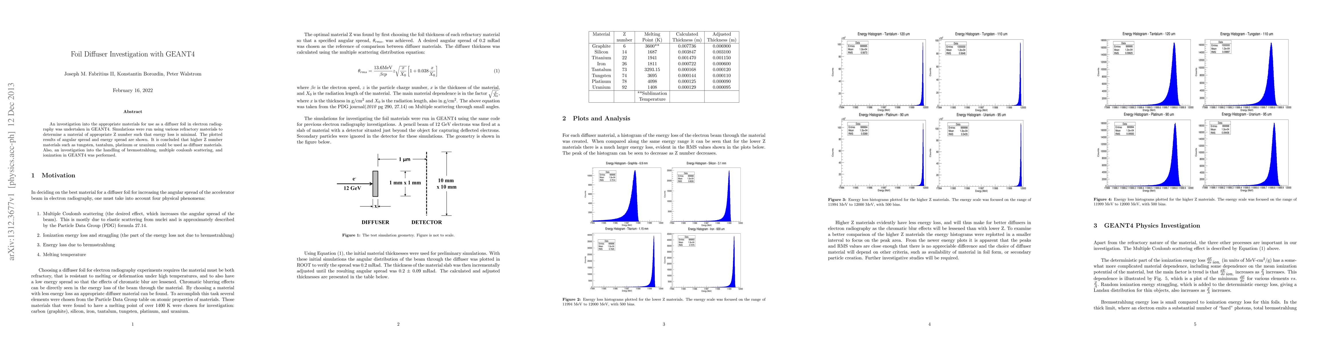 The research utilized GEANT4 simulations to evaluate refractory materials for electron diffuser foils in radiography. Higher Z number materials like tungsten, tantalum, platinum, and uranium were identified as suitable due to minimal energy loss. The study also explored GEANT4's handling of bremsstrahlung, multiple coulomb scattering, and ionization.