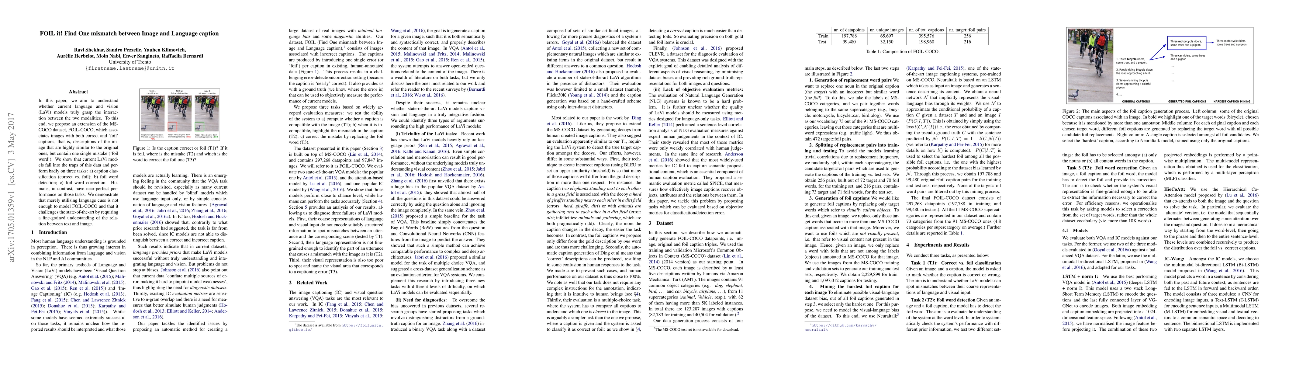 In this paper, we aim to understand whether current language and vision (LaVi) models truly grasp the interaction between the two modalities. To this end, we propose an extension of the MSCOCO dataset, FOIL-COCO, which associates images with both correct and "foil" captions, that is, descriptions of the image that are highly similar to the original ones, but contain one single mistake ("foil word"). We show that current LaVi models fall into the traps of this data and perform badly on three tasks: a) caption classification (correct vs. foil); b) foil word detection; c) foil word correction. Humans, in contrast, have near-perfect performance on those tasks. We demonstrate that merely utilising language cues is not enough to model FOIL-COCO and that it challenges the state-of-the-art by requiring a fine-grained understanding of the relation between text and image.