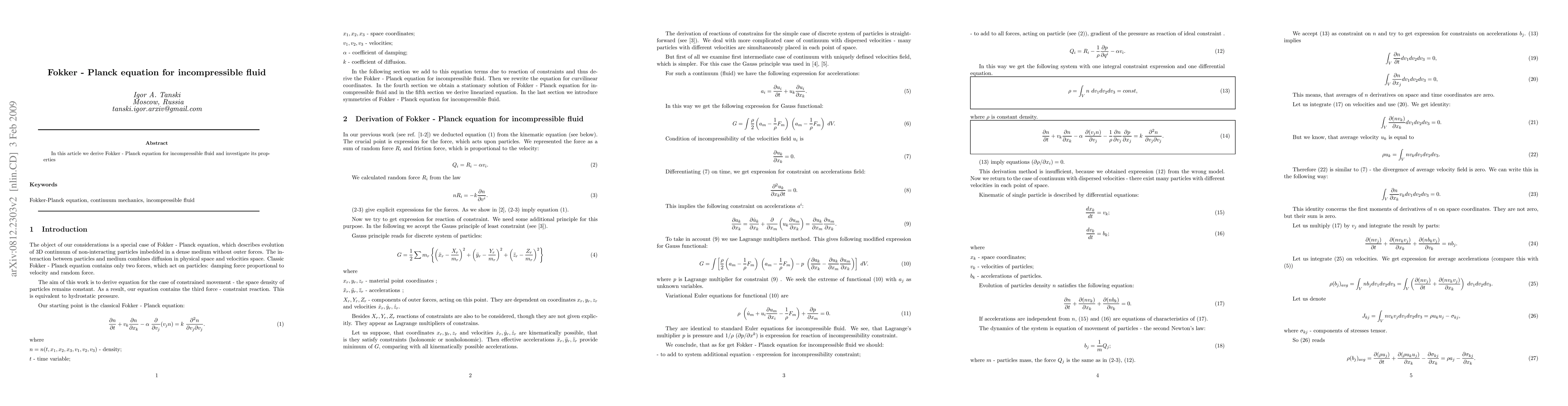 This paper derives the Fokker-Planck equation for incompressible fluid dynamics and examines its properties, with version 2 including additional symmetries of linearized equations and examples of invariant solutions.