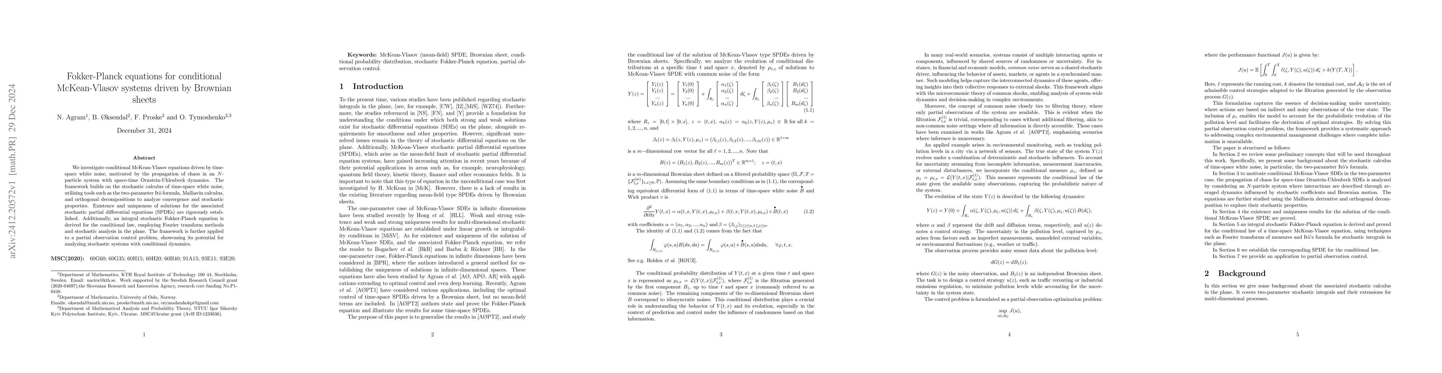 This paper develops Fokker-Planck equations for conditional McKean-Vlasov systems driven by Brownian sheets, establishing existence and uniqueness of solutions for associated stochastic partial differential equations. It applies the framework to a partial observation control problem, demonstrating its utility in analyzing conditional stochastic dynamics.