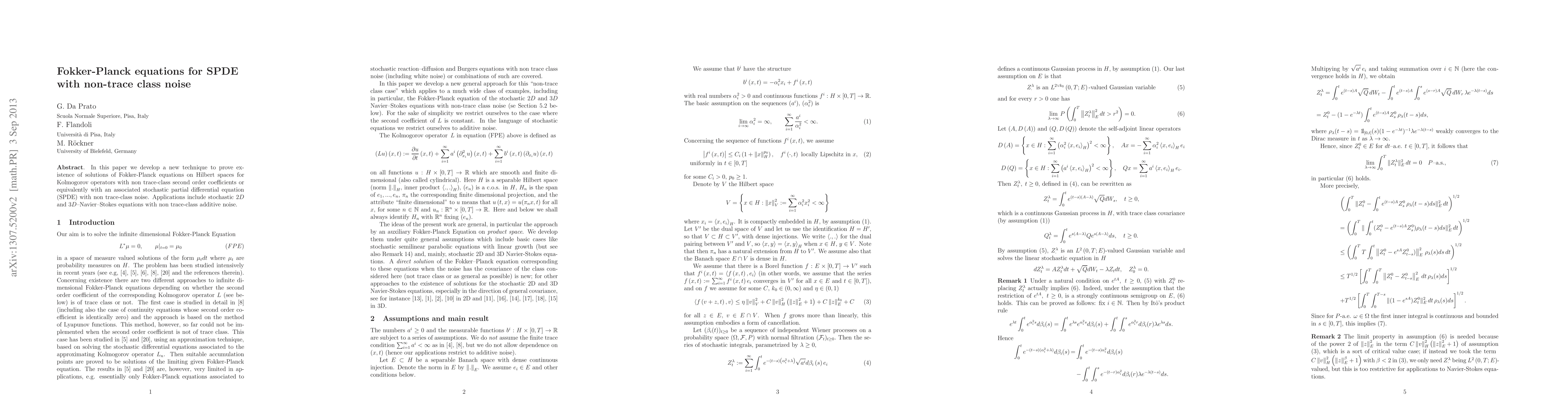 In this paper we develop a new technique to prove existence of solutions of Fokker-Planck equations on Hilbert spaces for Kolmogorov operators with non trace-class second order coefficients or equivalently with an associated stochastic partial differential equation (SPDE) with non trace-class noise. Applications include stochastic 2D and 3D-Navier-Stokes equations with non trace-class additive noise.