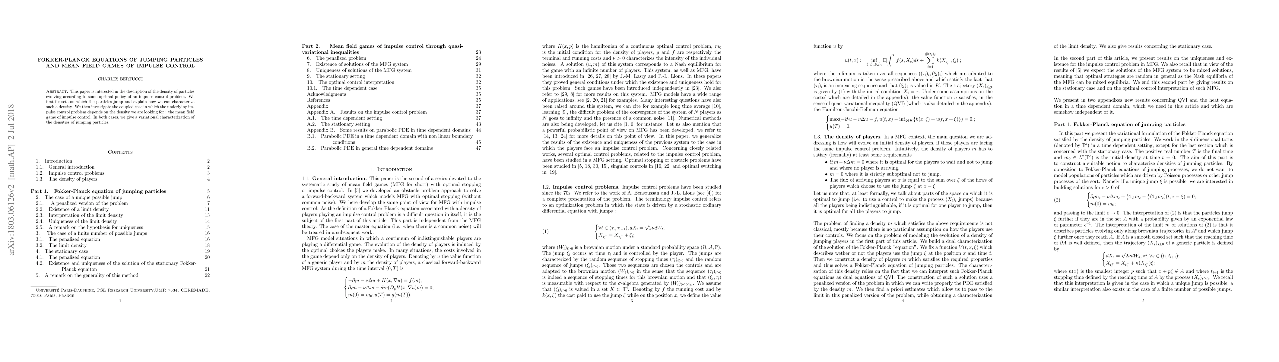 This paper is interested in the description of the density of particles evolving according to some optimal policy of an impulse control problem. We first fix sets on which the particles jump and explain how we can characterize such a density. We then investigate the coupled case in which the underlying impulse control problem depends on the density we are looking for : the mean field games of impulse control. In both cases, we give a variational characterization of the densities of jumping particles.