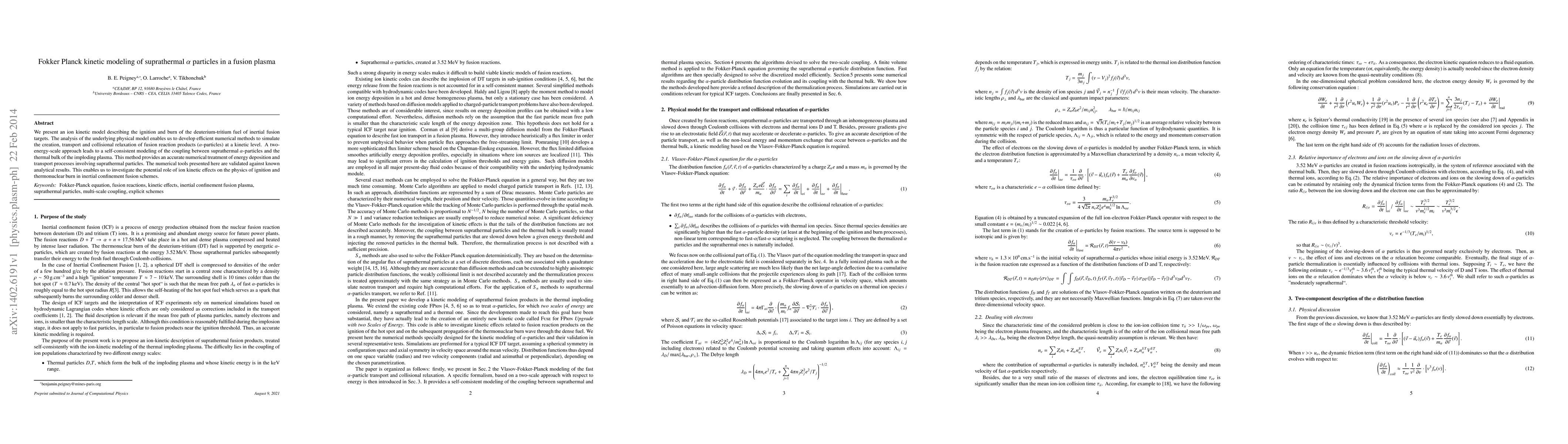 This paper develops a kinetic model for simulating the behavior of suprathermal alpha-particles in fusion plasmas, focusing on inertial fusion targets. The model accurately captures energy deposition and transport processes, validated against analytical results, and investigates ion kinetic effects on ignition and burn processes.