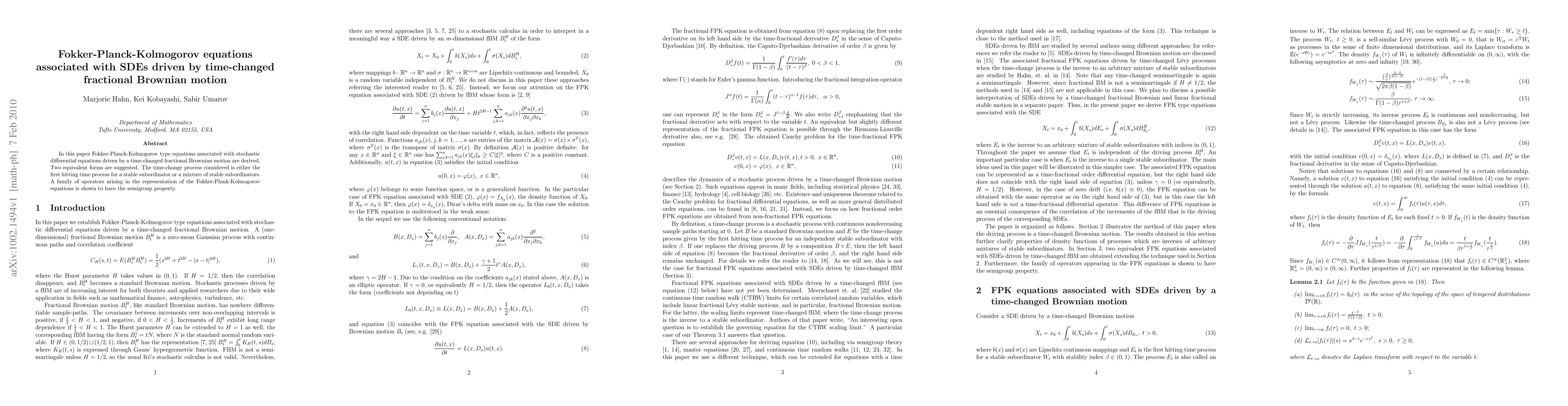 Summary: This paper derives Fokker-Planck-Kolmogorov equations for stochastic differential equations driven by time-changed fractional Brownian motion, proposing two equivalent forms. It explores the semigroup property of operators arising in these equations, utilizing either a stable subordinator's first hitting time or a mixture of such subordinators.