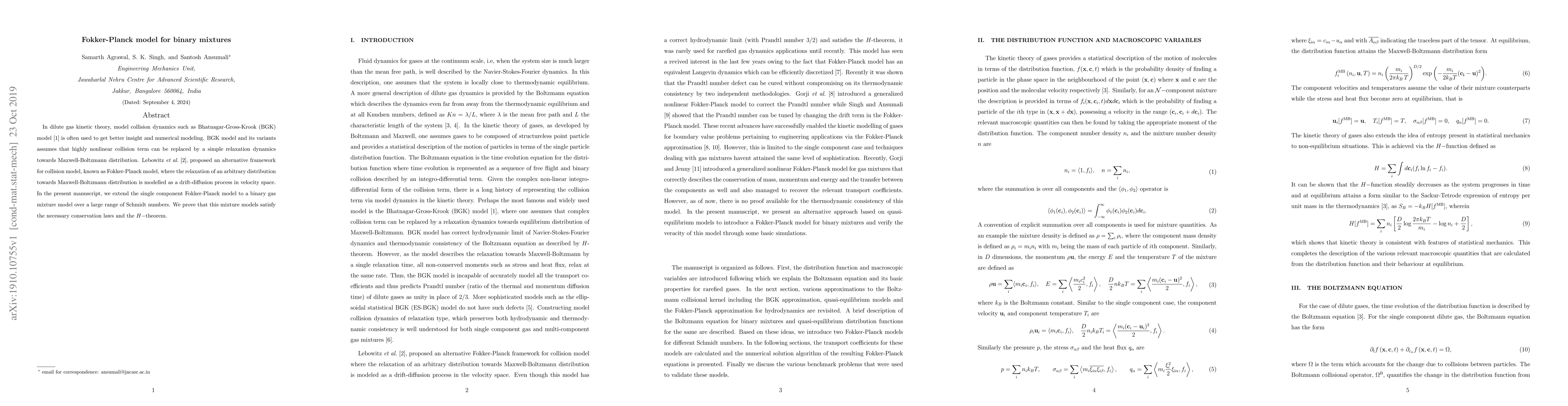 This paper extends the Fokker-Planck model, originally developed for single-component gases, to binary gas mixtures, demonstrating its applicability over a wide range of Schmidt numbers. The authors prove that the extended model satisfies conservation laws and the H-theorem, providing a robust framework for collision dynamics in dilute gas mixtures.
