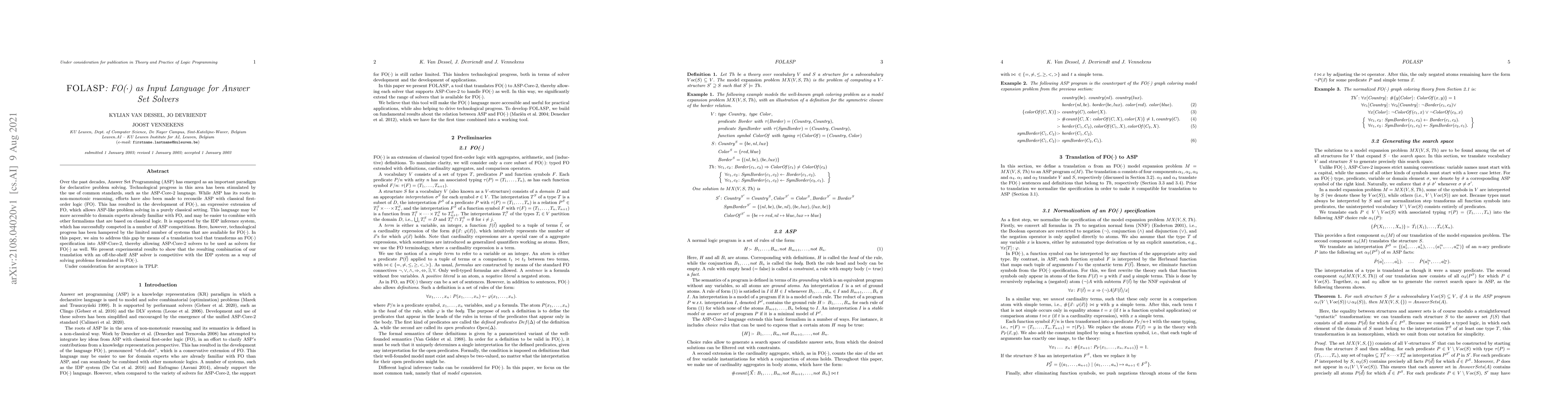 This paper introduces FOLASP, a translation tool that converts FO(.) specifications into ASP-Core-2, enabling ASP solvers to solve problems expressed in FO(.). Experimental results demonstrate that this approach is competitive with the IDP system, addressing the scarcity of FO(.) solvers.
