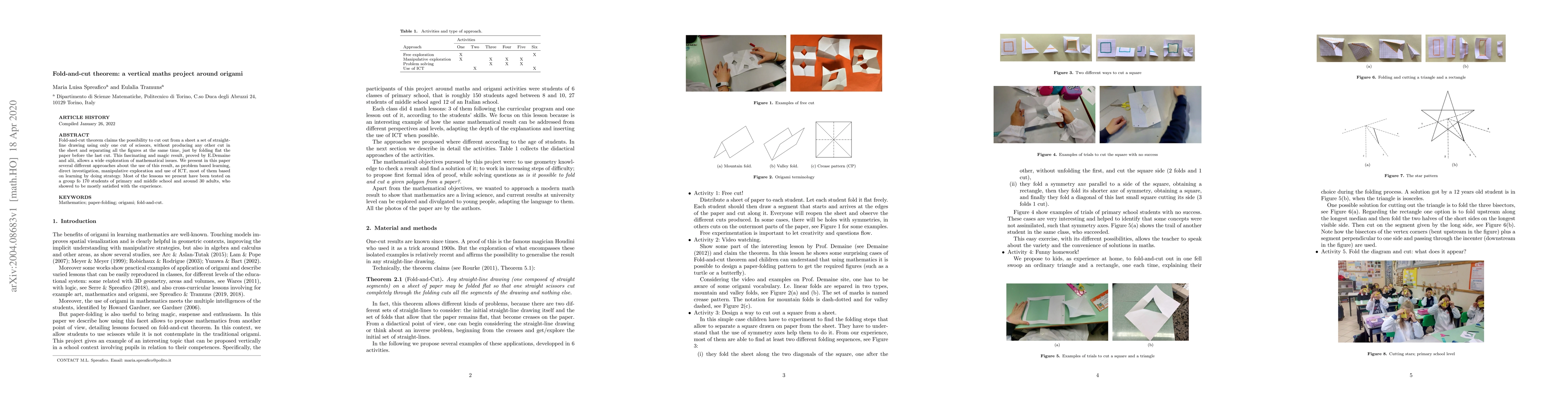 This paper explores the 'Fold-and-cut theorem', a mathematical concept that allows cutting straight lines from a sheet with one cut of scissors using only folding, and tests its effectiveness in primary and middle school students.